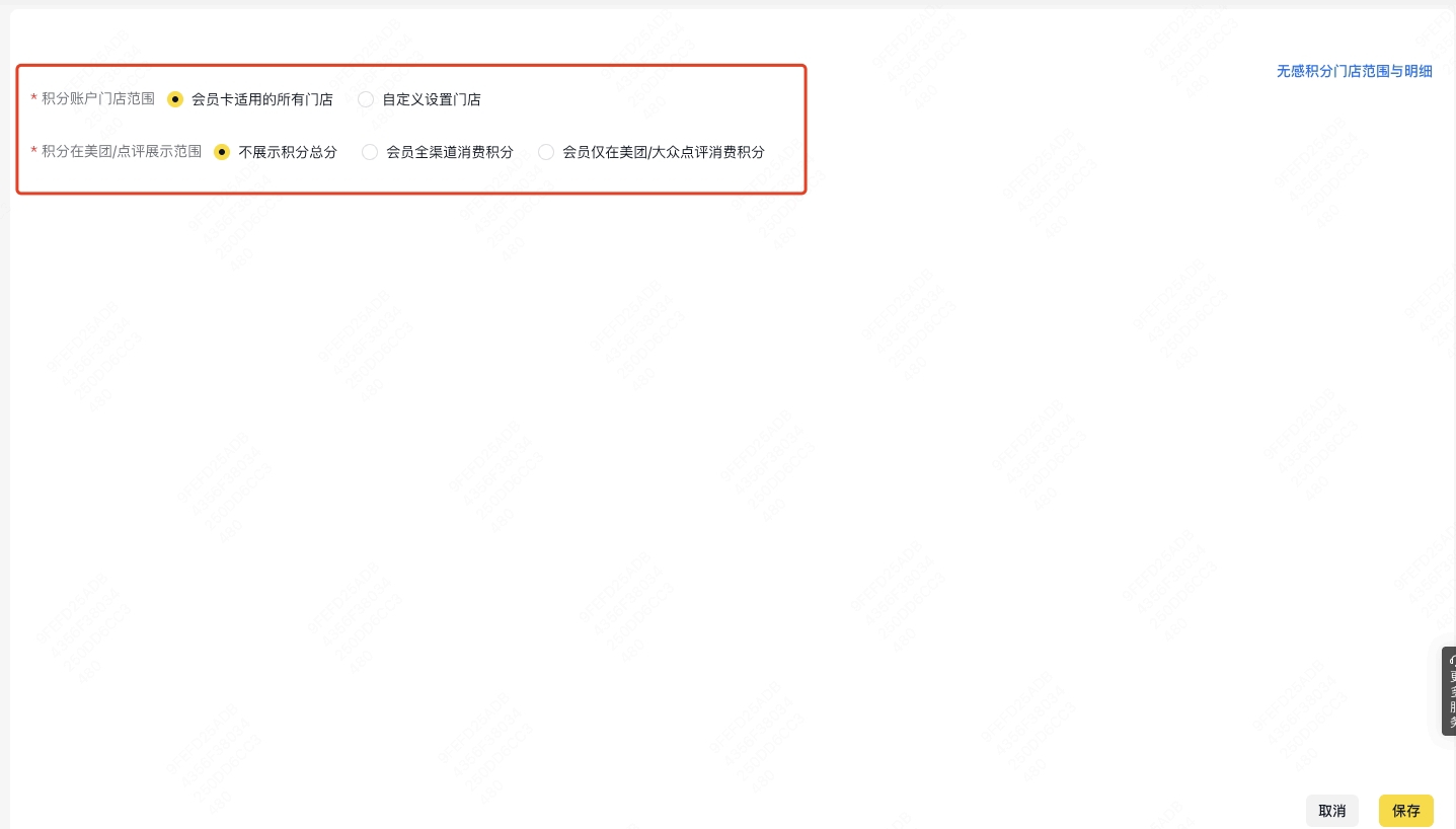 - 积分账户门店范围:此处可固定选择「会员卡适用的所有门店」,在具体圈店过程中还会再次配置各门店是否可获得积分