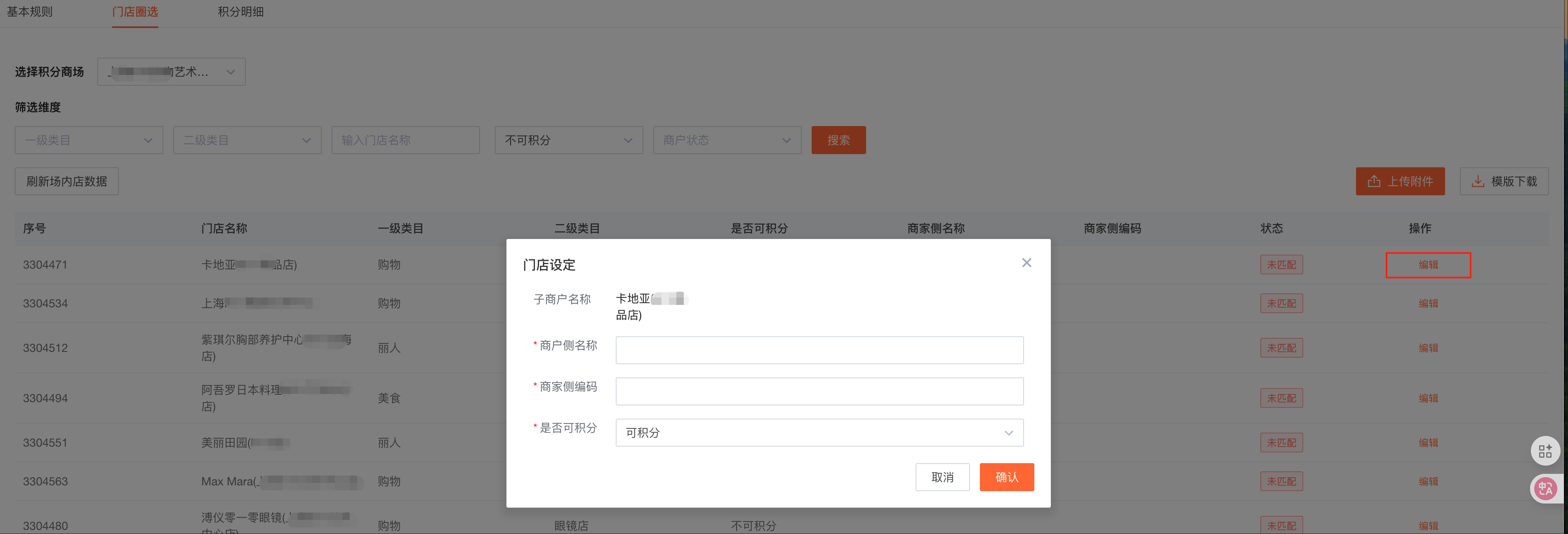 商场运营人员需通过「圈店」操作,建立商场与门店的映射关系,从而实现顾客在场内门店消费后获得积分。