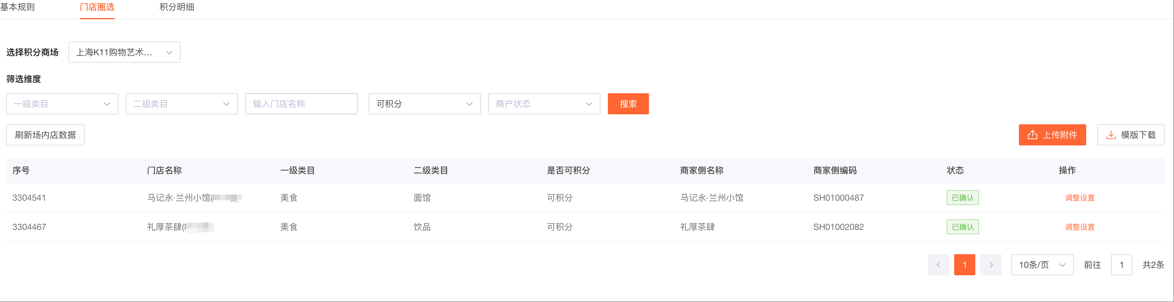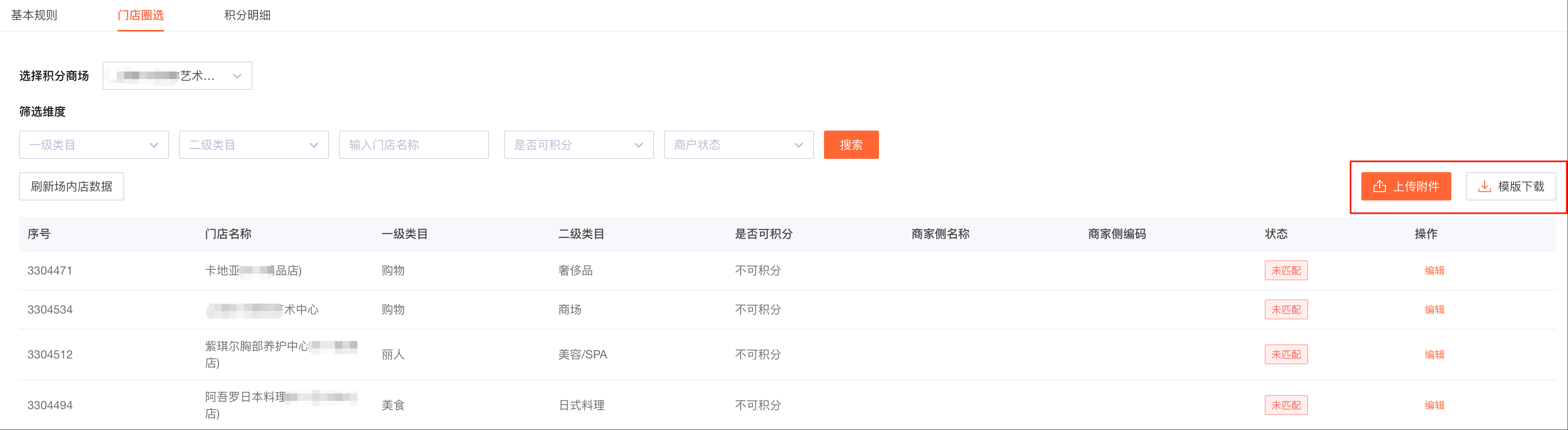 - 批量上传圈店:点击「模版下载」,在模板内填写商家名称、商家编码两个字段,填写完成后上传附件;其中商家编码必须与影能商管后台——商场/门店管理中的门店编码一致
