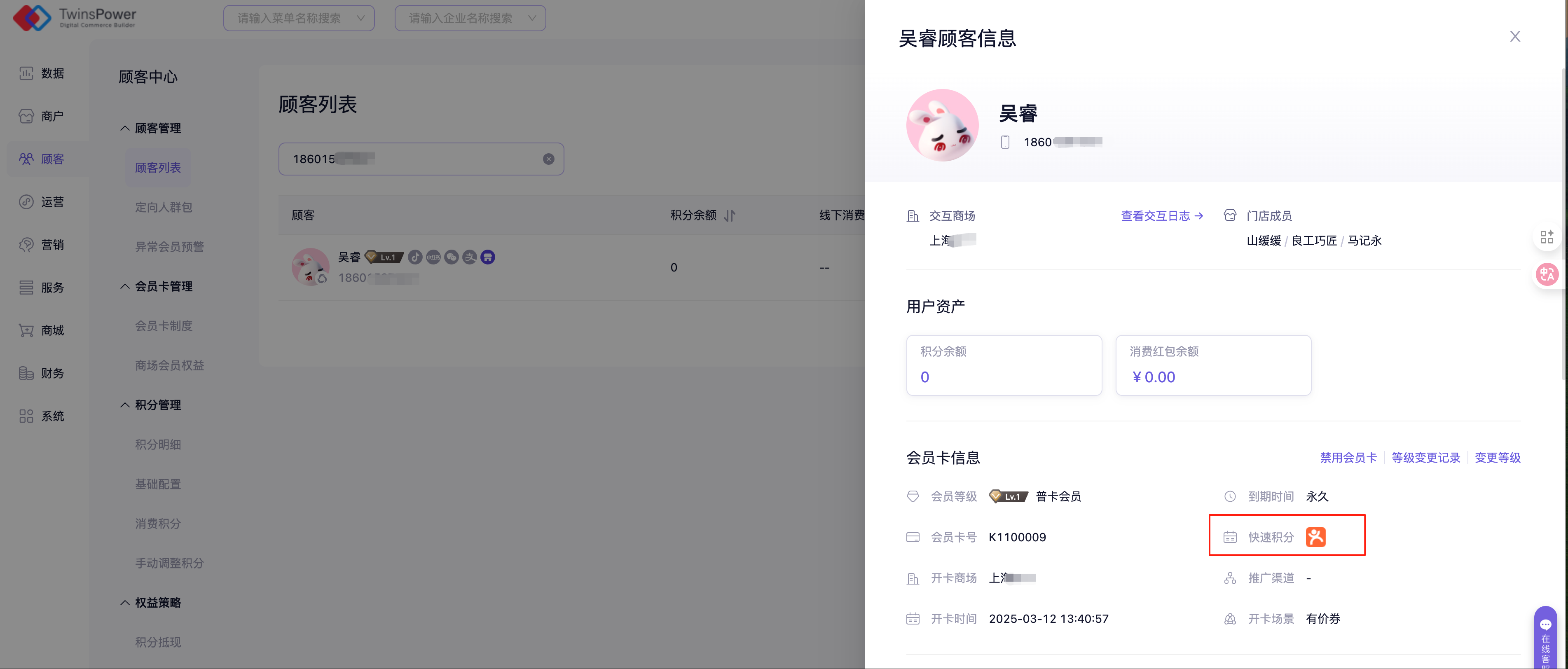 点击快速积分订单可查看订单详情,在这里可跳转查看对应的顾客信息详情