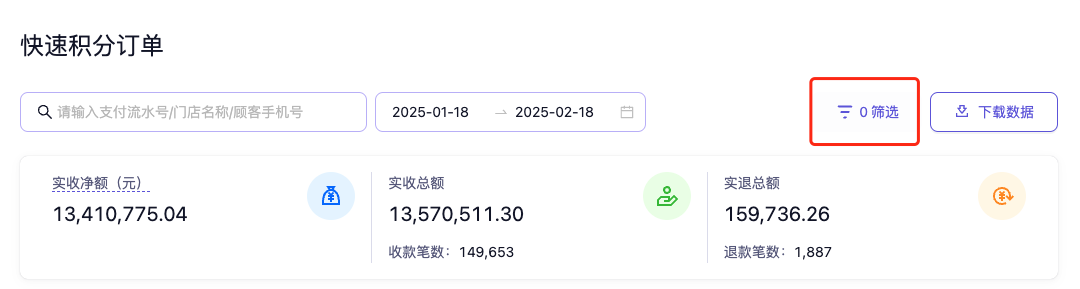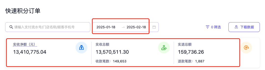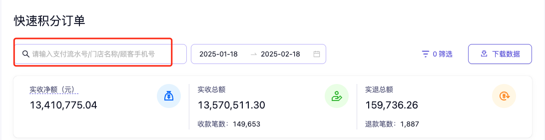 数据概览中默认展示近一个月所有门店的快速积分订单数据。可通过筛选时间范围,查看更多时间范围内的订单数据。(一次最多可筛选3个月)