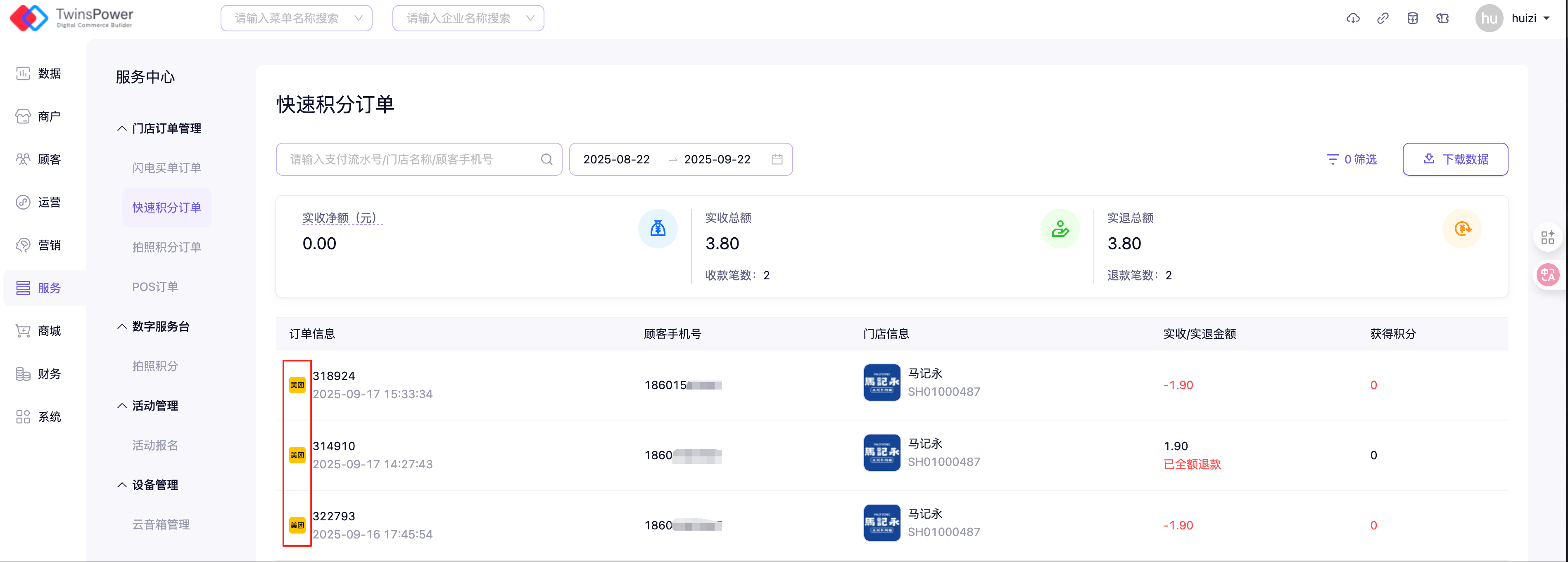 在门店订单管理——快速积分订单中,可查询所有微信/支付宝/美团的支付即积分能力收集到的订单数据。