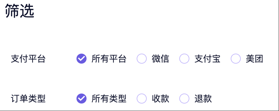 可以通过筛选进行支付平台,订单类型,是否有退款进行筛选