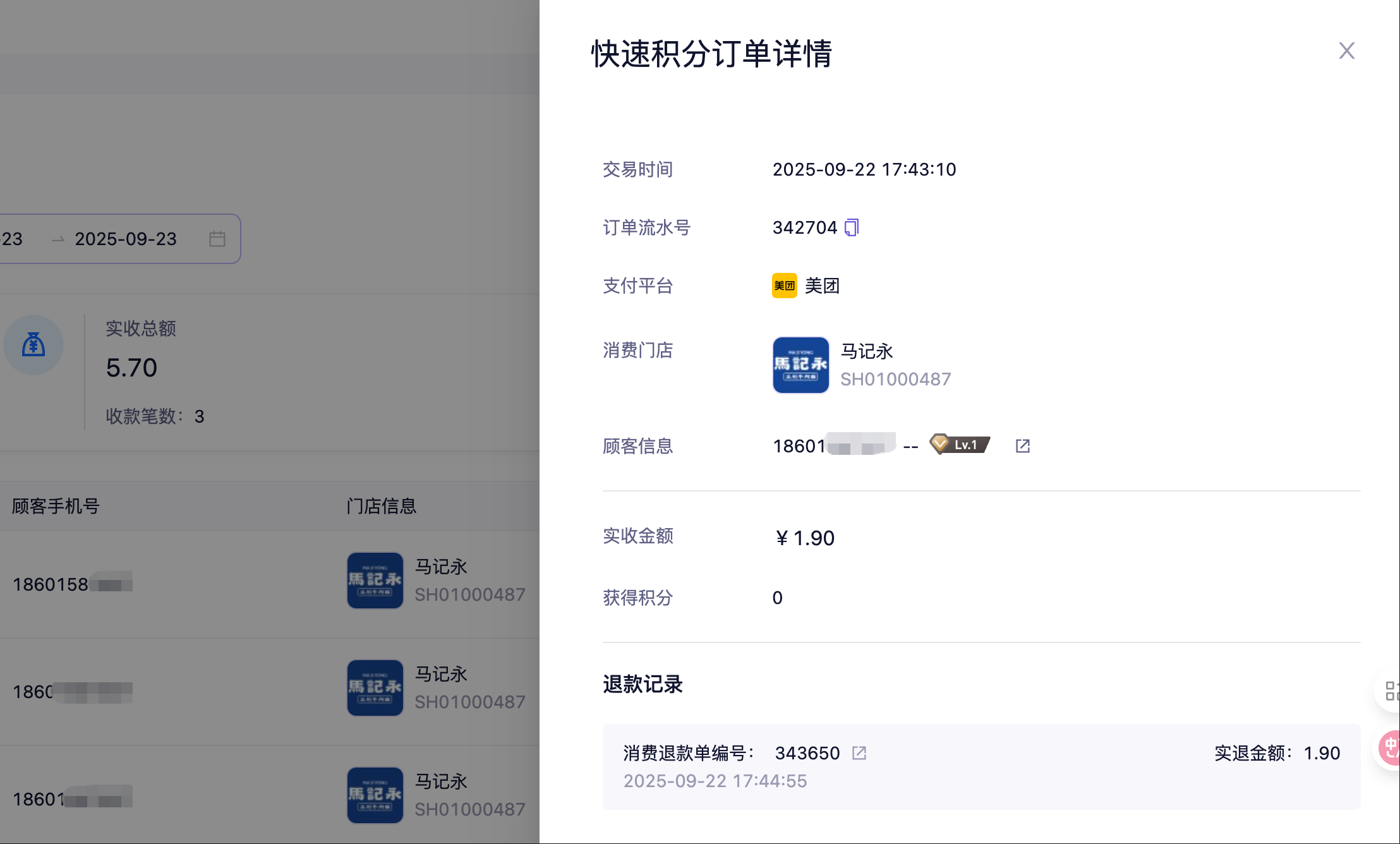 可以通过门店名称/顾客手机号进行指定快速积分订单的搜索,同时数据可下载。