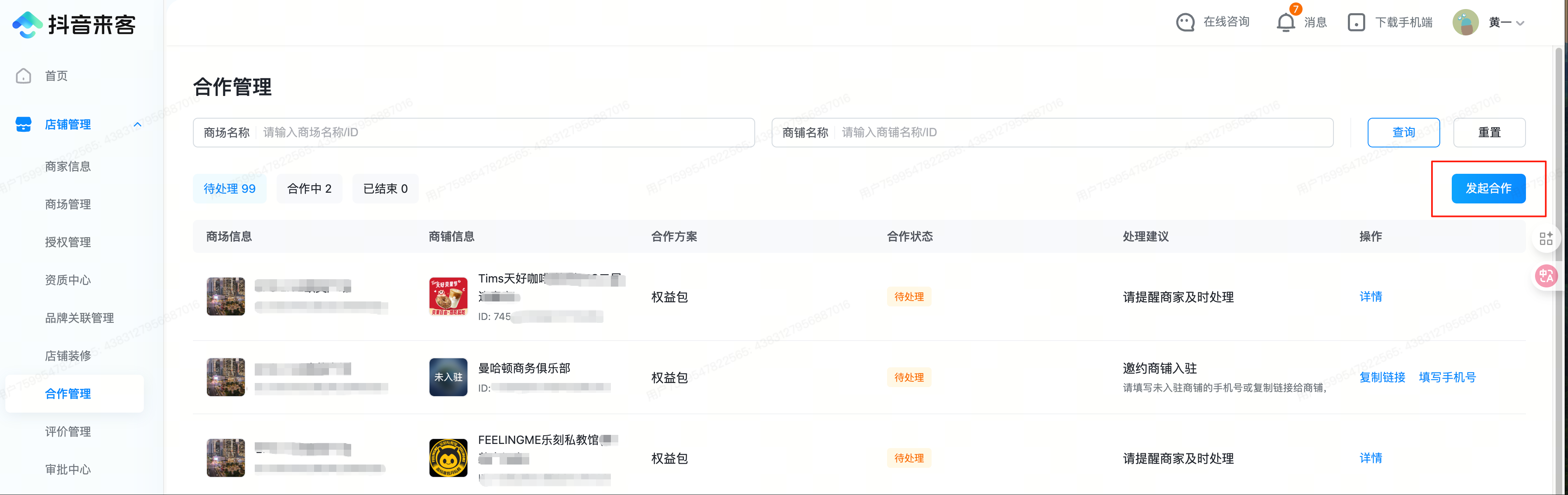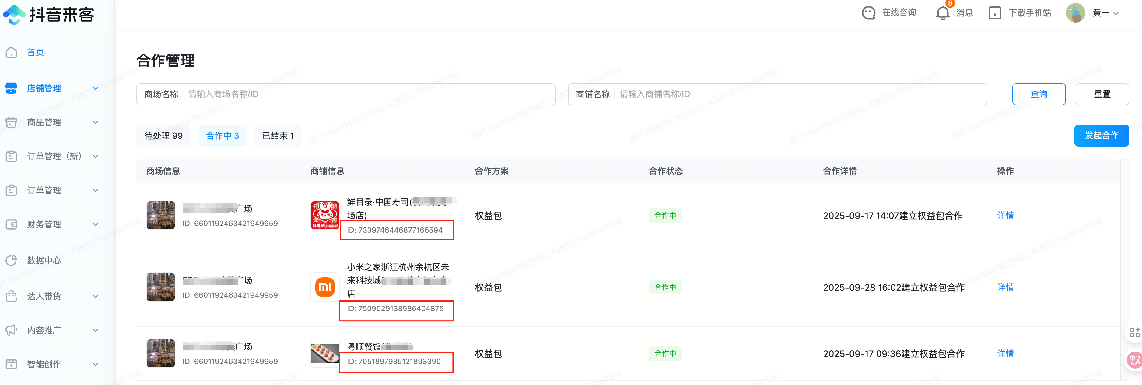 - 在店铺管理——合作管理中,可分别筛选查看待处理、合作中、已结束的门店,仅「合作中」的门店才可以进行权益包合作。