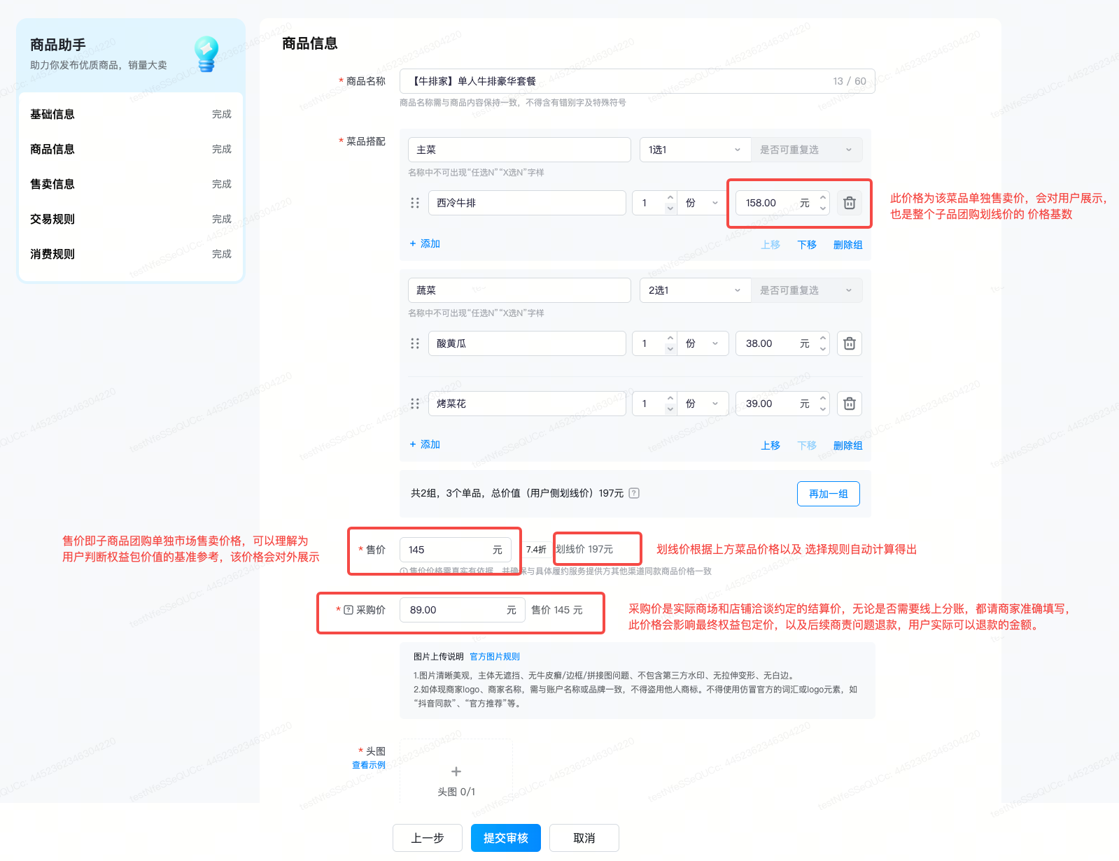 - 填写子品信息,核心维护采购价、商品详情信息,提交审核。注意填写的内容都应如实填写,以防客诉。
