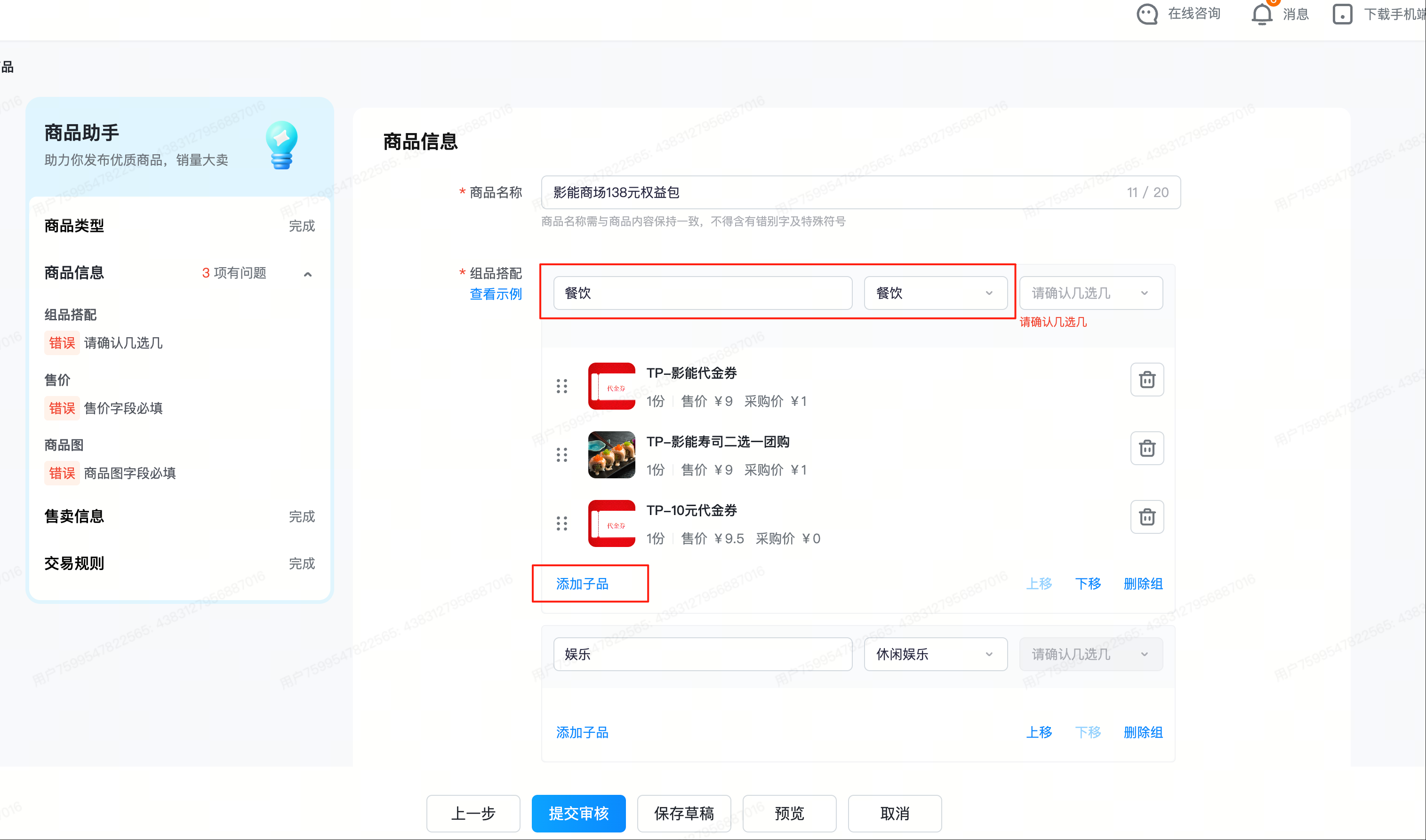 - 组品搭配:可用业态分类,如餐饮/娱乐/购物,在每个业态中选择添加子品,选中在上一步创建好的权益包子品;全部内容填写完成后提交审核