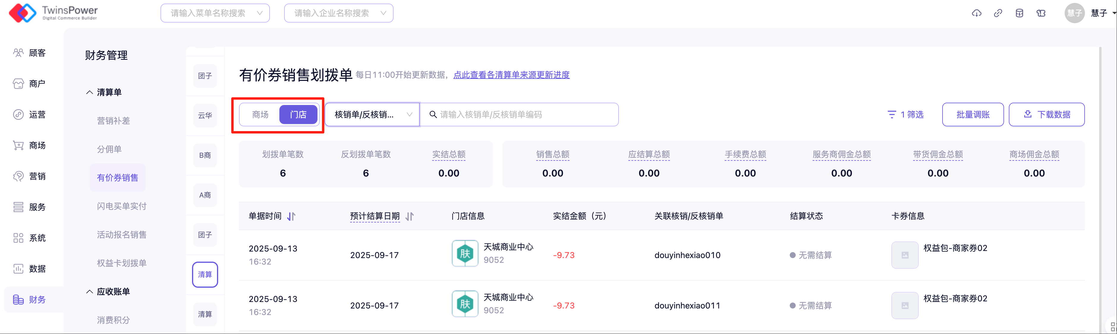 - 有价券销售划拨单分商场和门店两种,权益包生成的划拨单资金结算对象均为门店,固需要切换至「门店」查看划拨单数据
