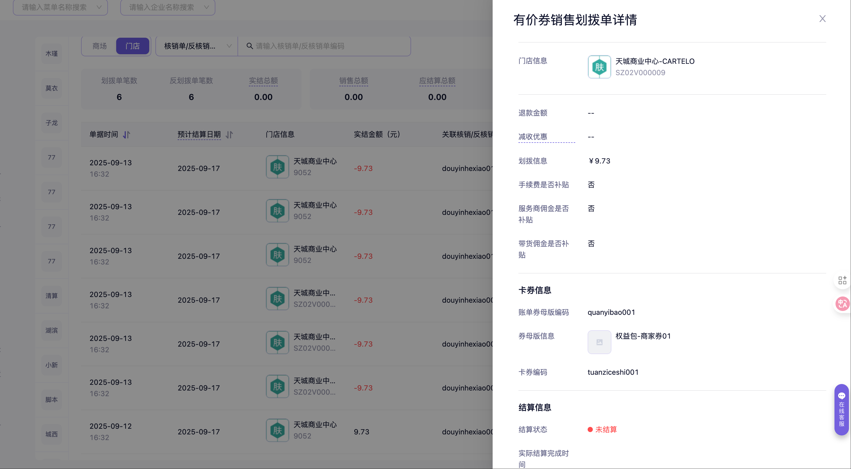 - 未结算:表示该卡券的实结金额还没有结算给对应的结算户