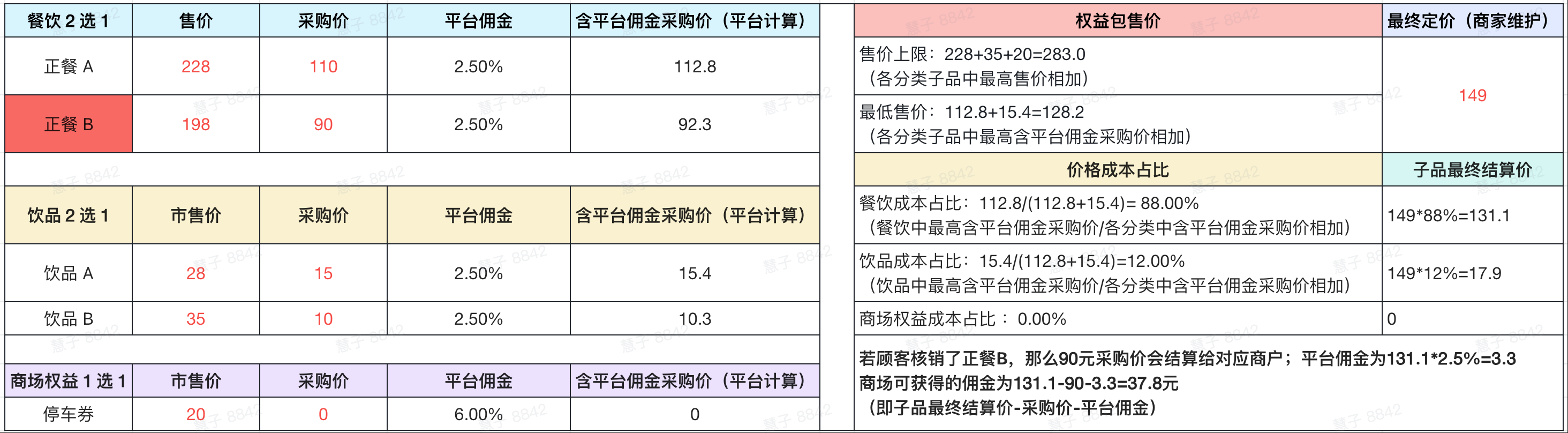 顾客核销了正餐B,那么90元采购价会结算给对应商户,商场可获得的佣金为131.1-90-3.3=37.8元
