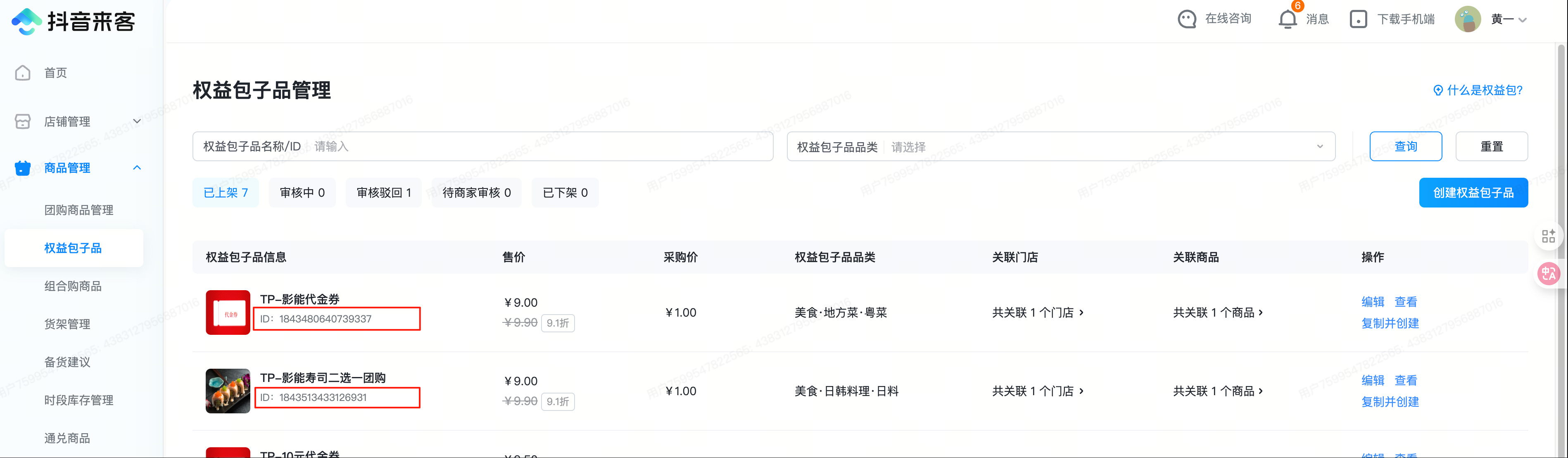 - 子品审核通过后,在列表处商品名称的下方可查看子品ID,在影能侧创建权益包时需要使用