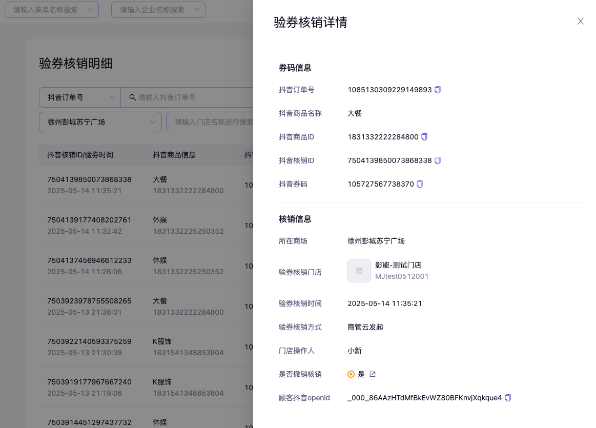 - 可以通过抖音订单号/抖音核销ID/抖音商品ID/抖音商品名称搜索指定的验券核销明细