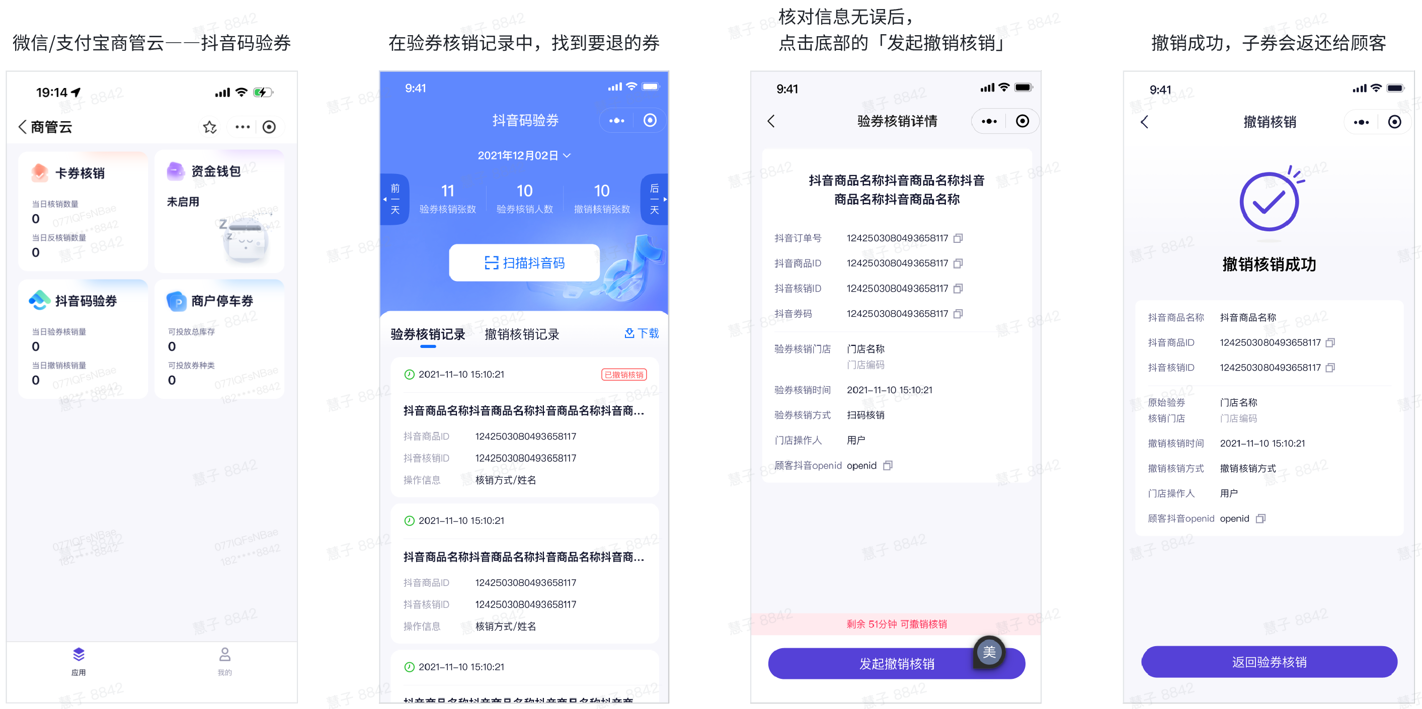 支持通过抖音订单号/原始抖音核销ID/抖音商品ID/抖音商品名称搜索指定撤销核销明细