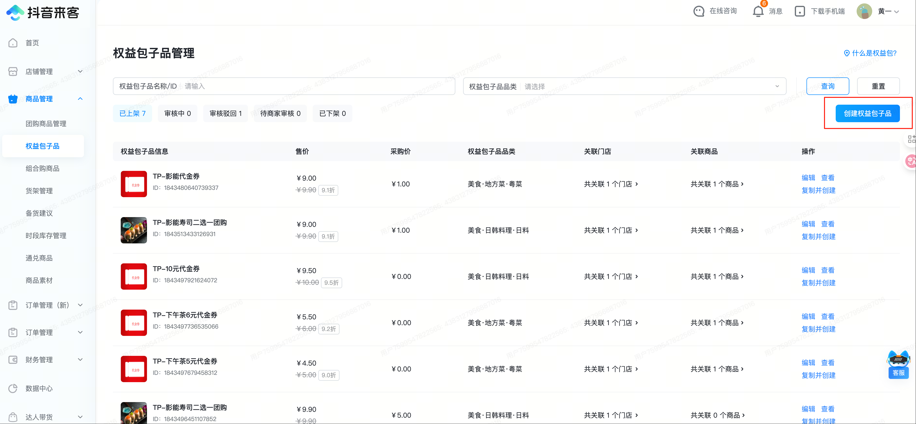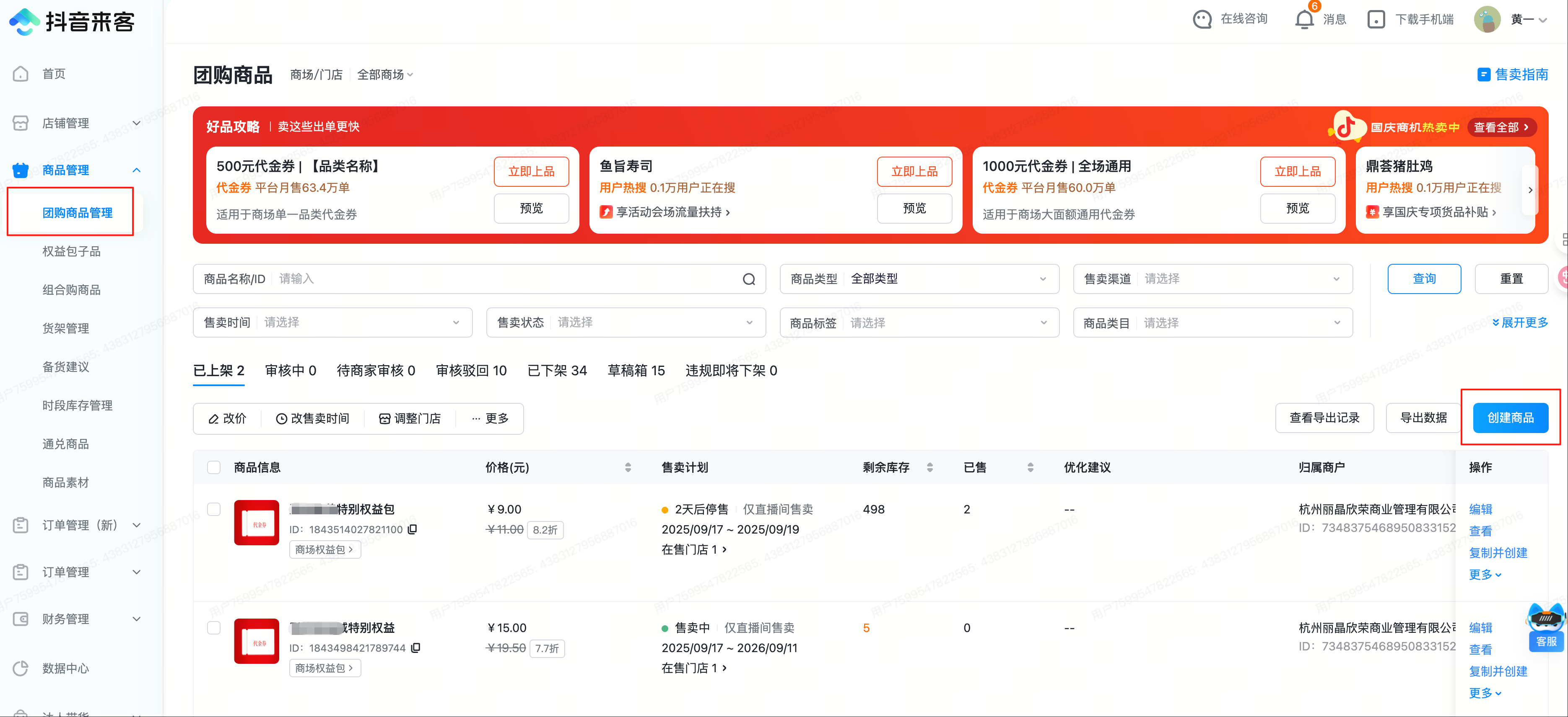 所有子品创建完成后,再创建权益包;在商品管理——团购商品管理中,点击「创建商品」