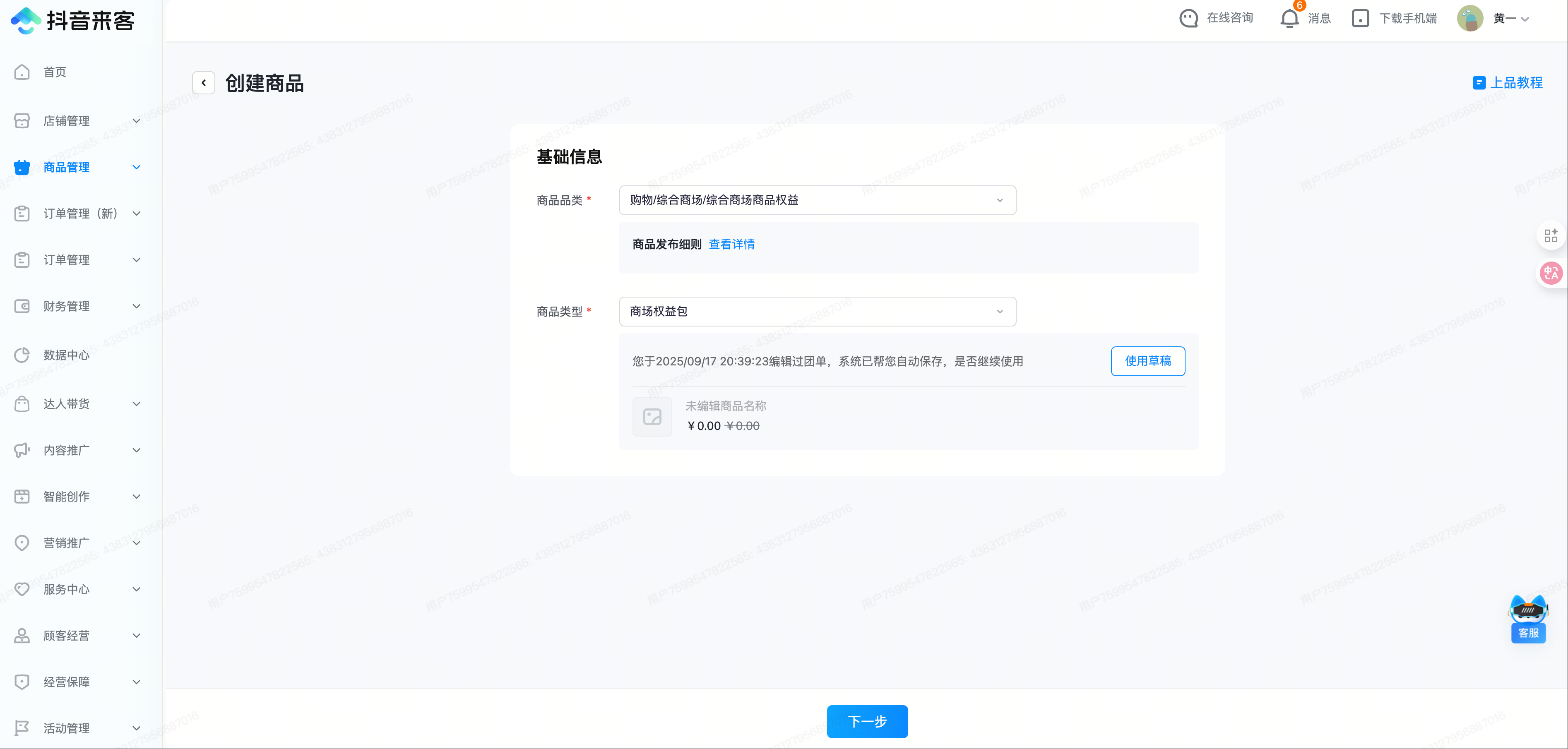 - 商品品类:固定选择「购物/综合商场/综合商场商品权益」