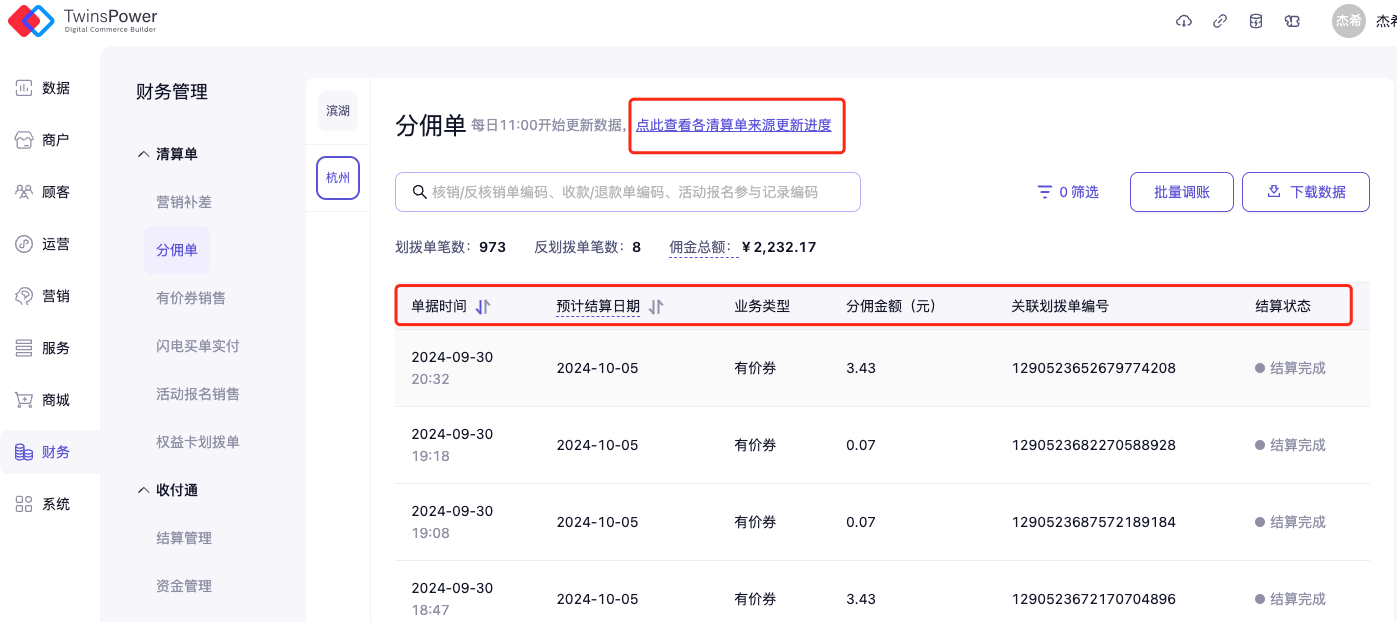 查看路径:财务——清算单——分佣单