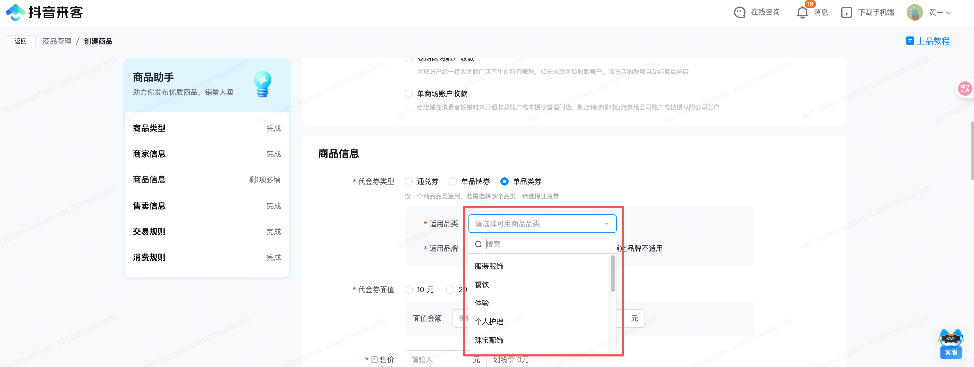 - 在「代金券类型」字段选择「单品类券」后,在「适用品类」字段的下拉选择框中查看可选择范围;