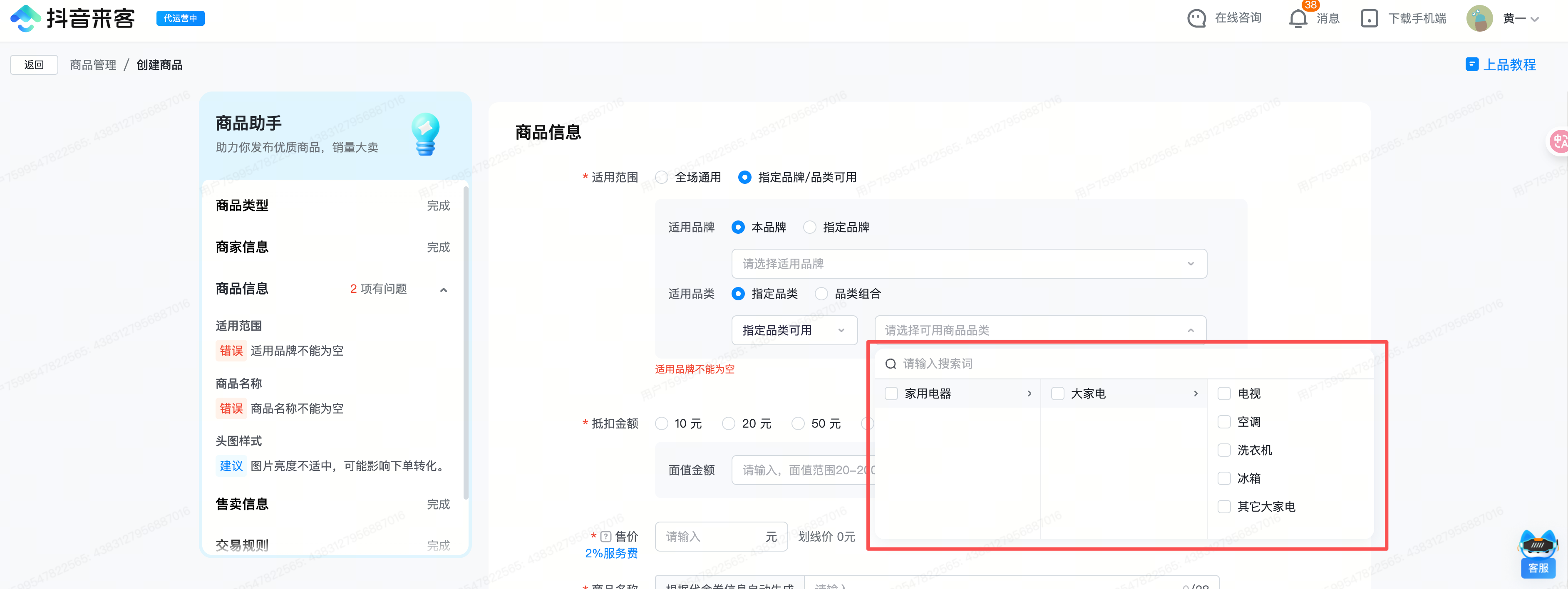以下图示例,创建有价券时商品品类是大家电,则适用品类可以填:电视,空调,洗衣机,冰箱,其他大家电,或者单独只填电视