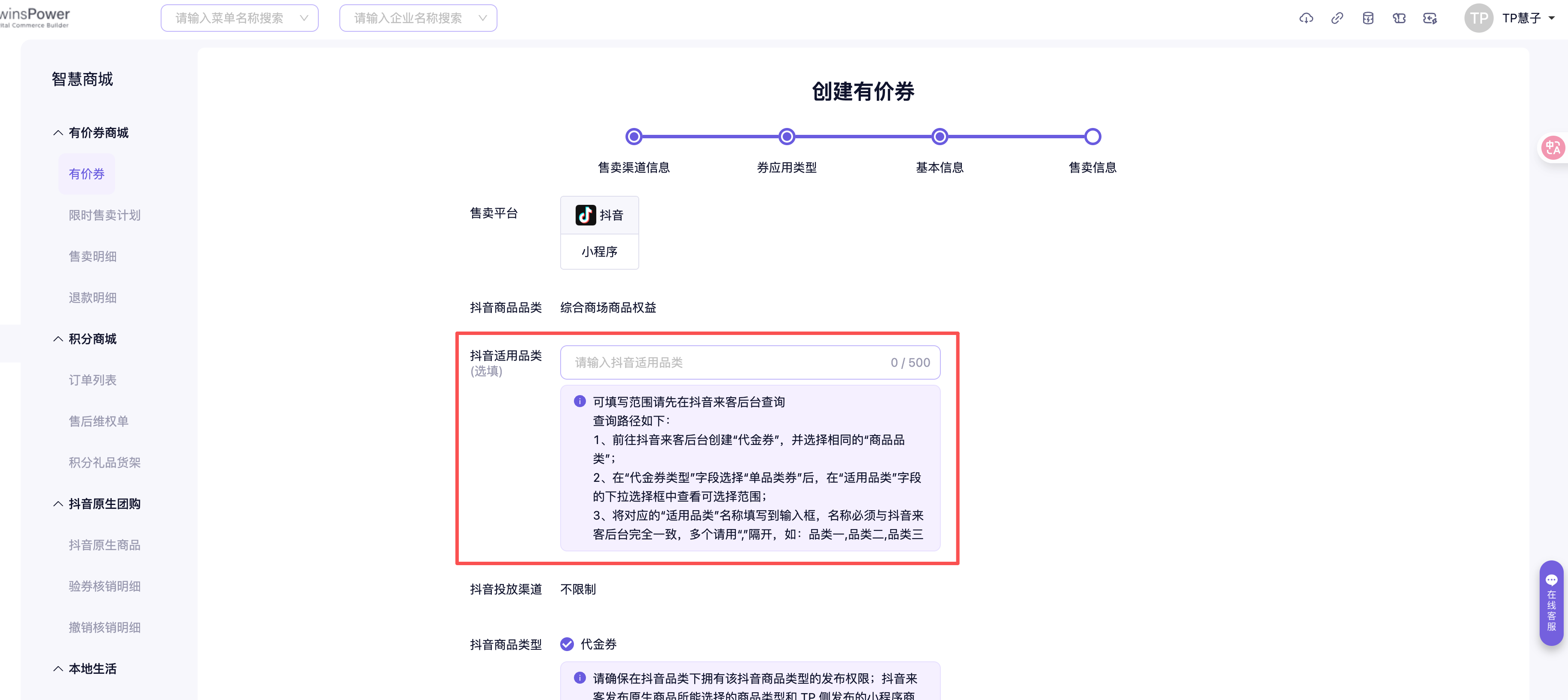 - 前往抖音来客后台创建「代金券」,并选择相同的「商品品类」(例如在影能创建有价券时商品品类是购物->数码3C->数码3C,则在来客也需选择该品类)