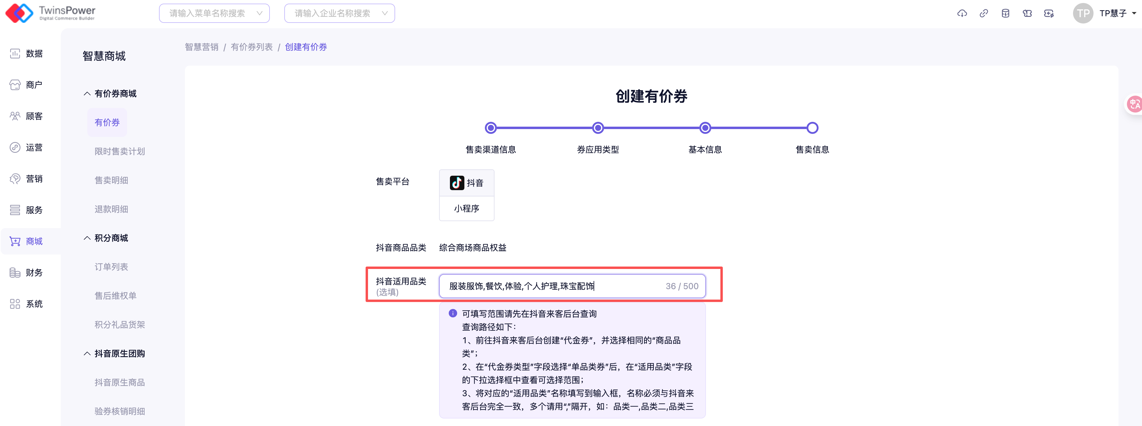 在影能后台创建普通券时,售卖信息页新增「抖音适用品类」字段。