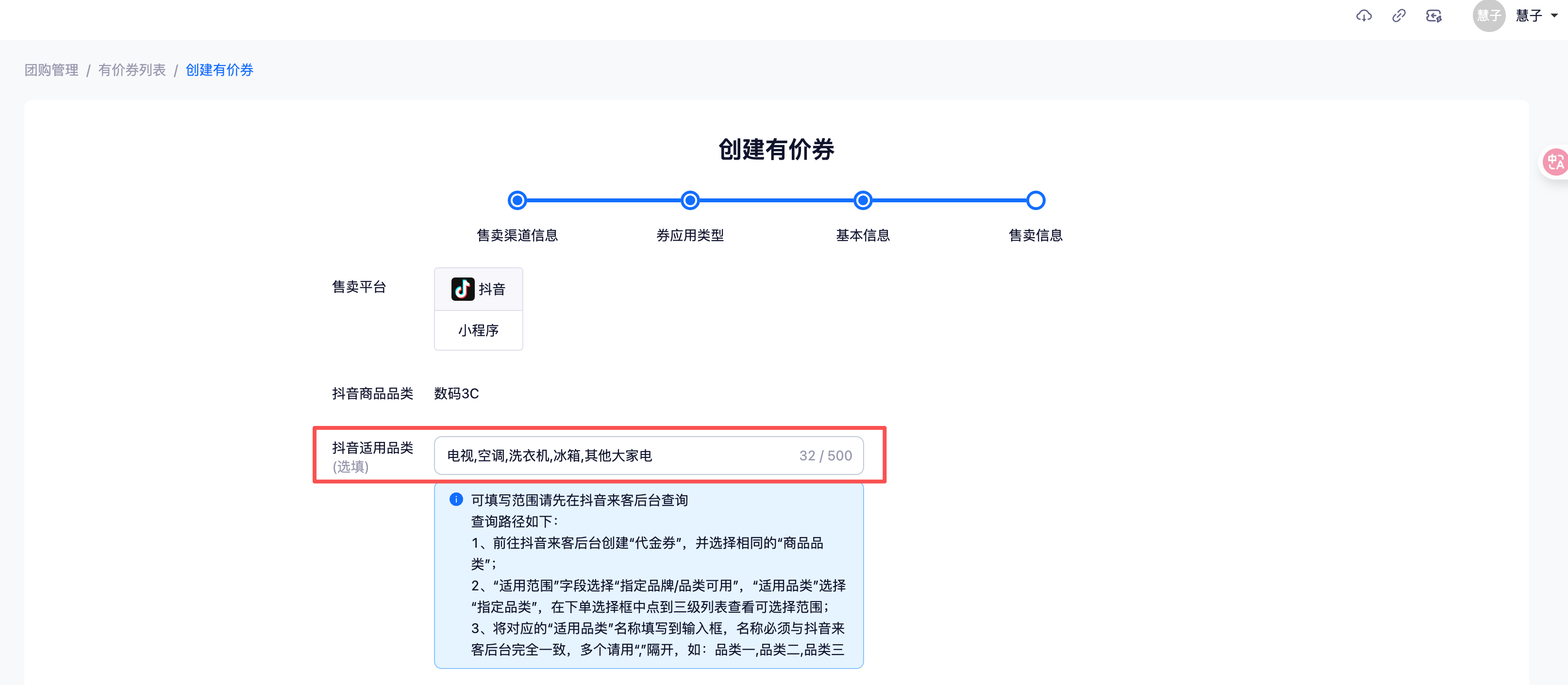 - 品类受限券:若券本身存在适用品类限制,需如实填写,否则可能被抖音来客判定为违规。