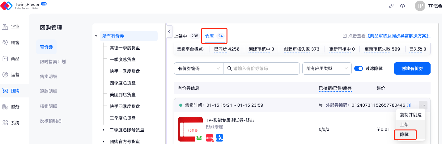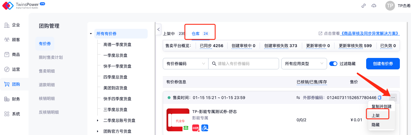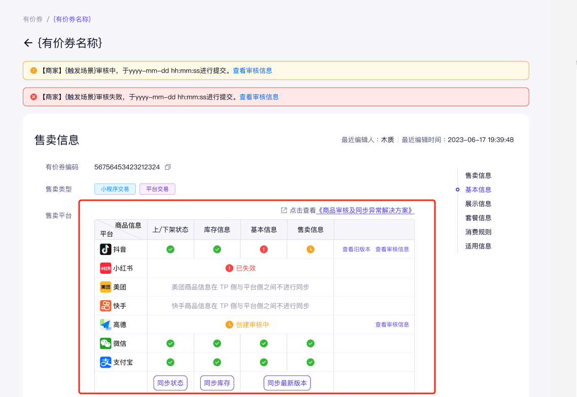 有价券创建完成后,点击进入有价券详情页,在售卖平台中可查看该有价券在各平台同步的最新信息,以及可针对不同状态进行处理: