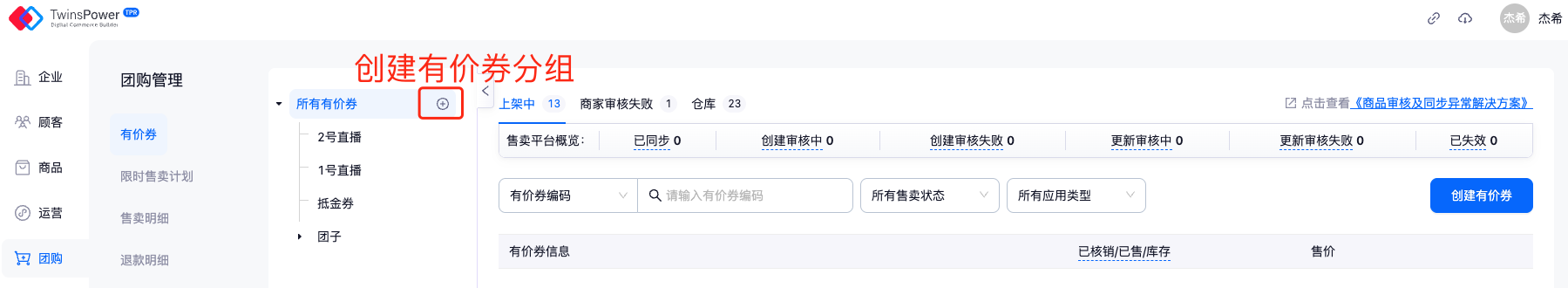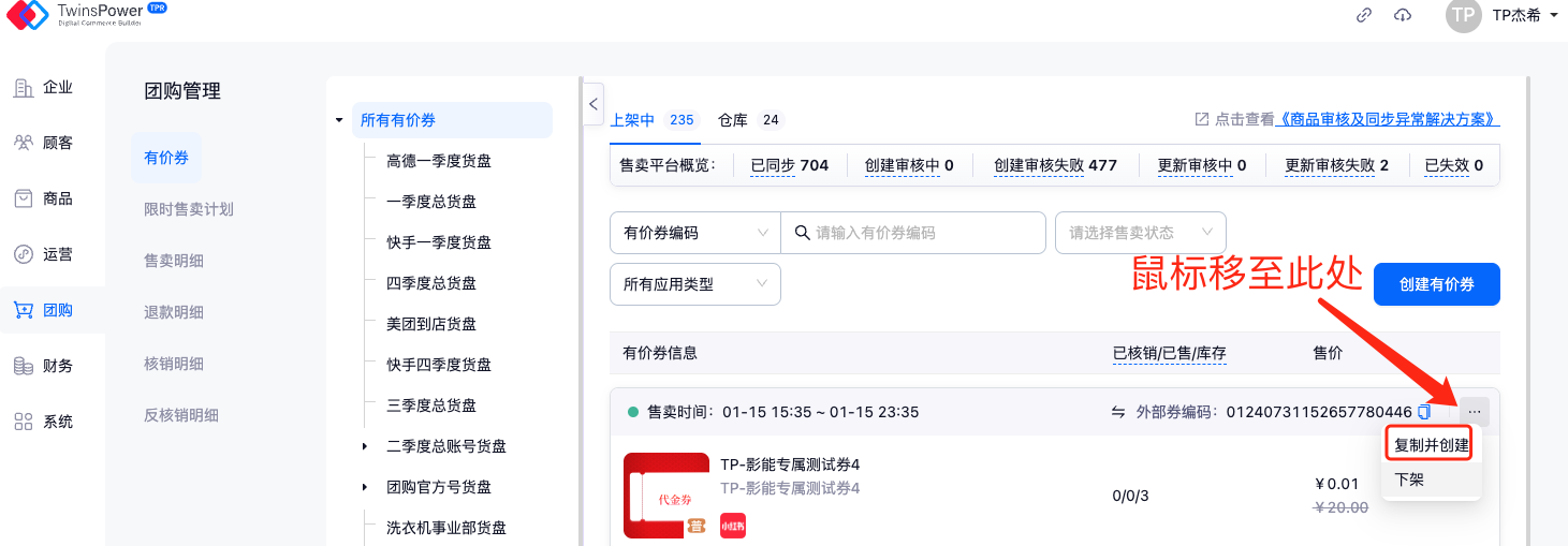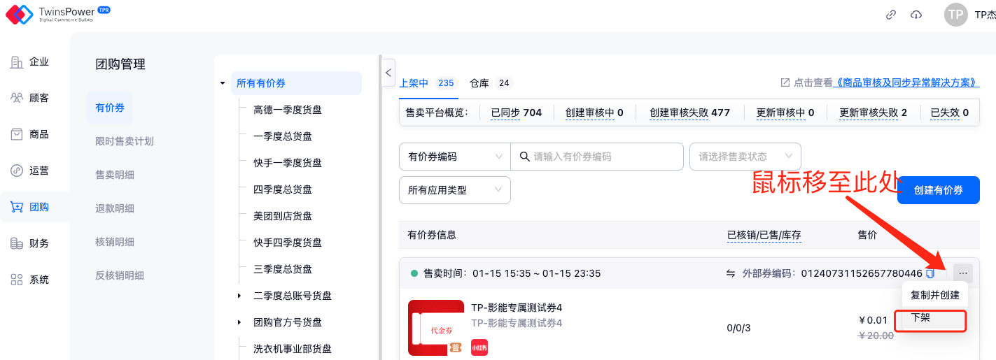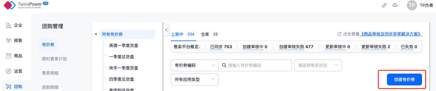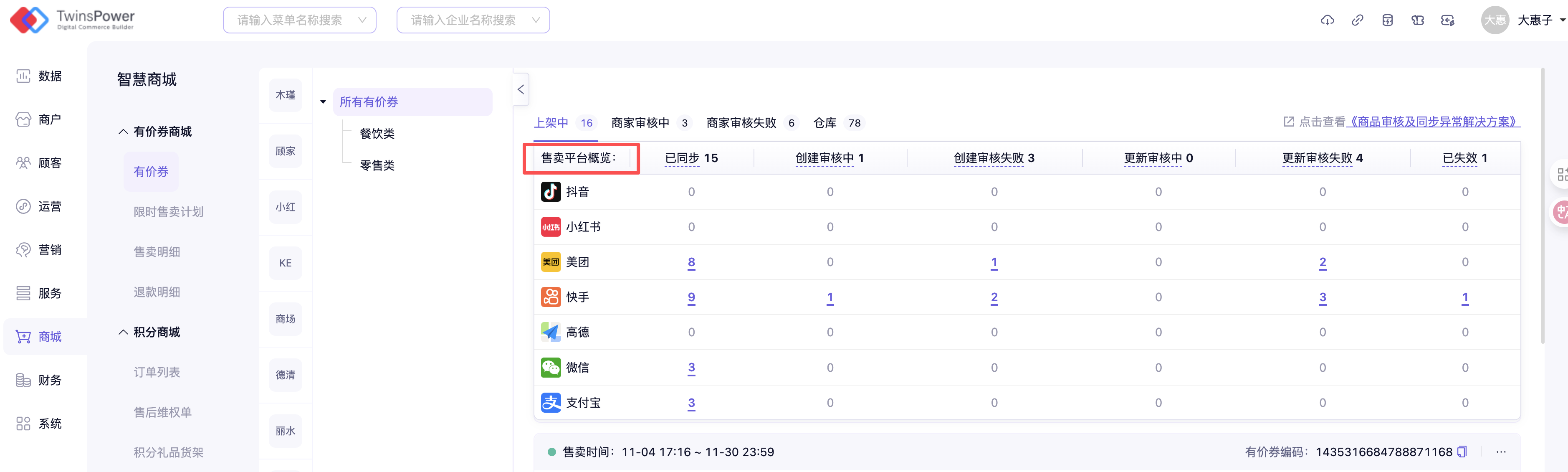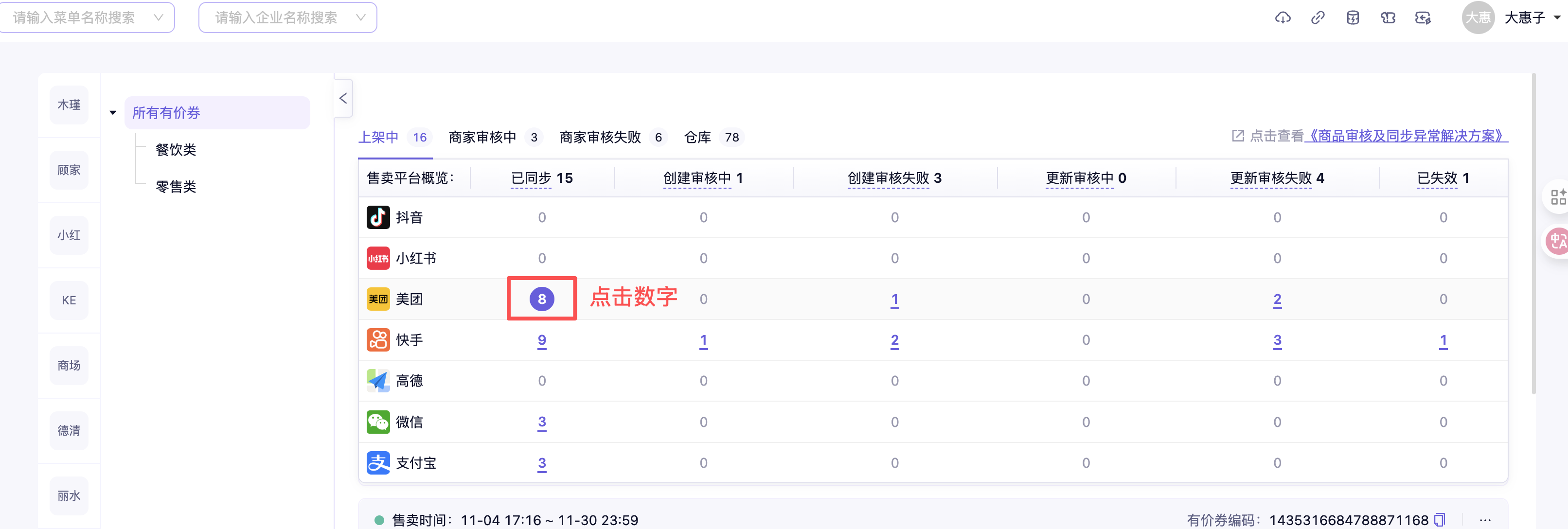 在售卖平台概览中可点击不同状态下券的数量,将会自动跳转至该状态下所有券列表中,从而进行券管理。