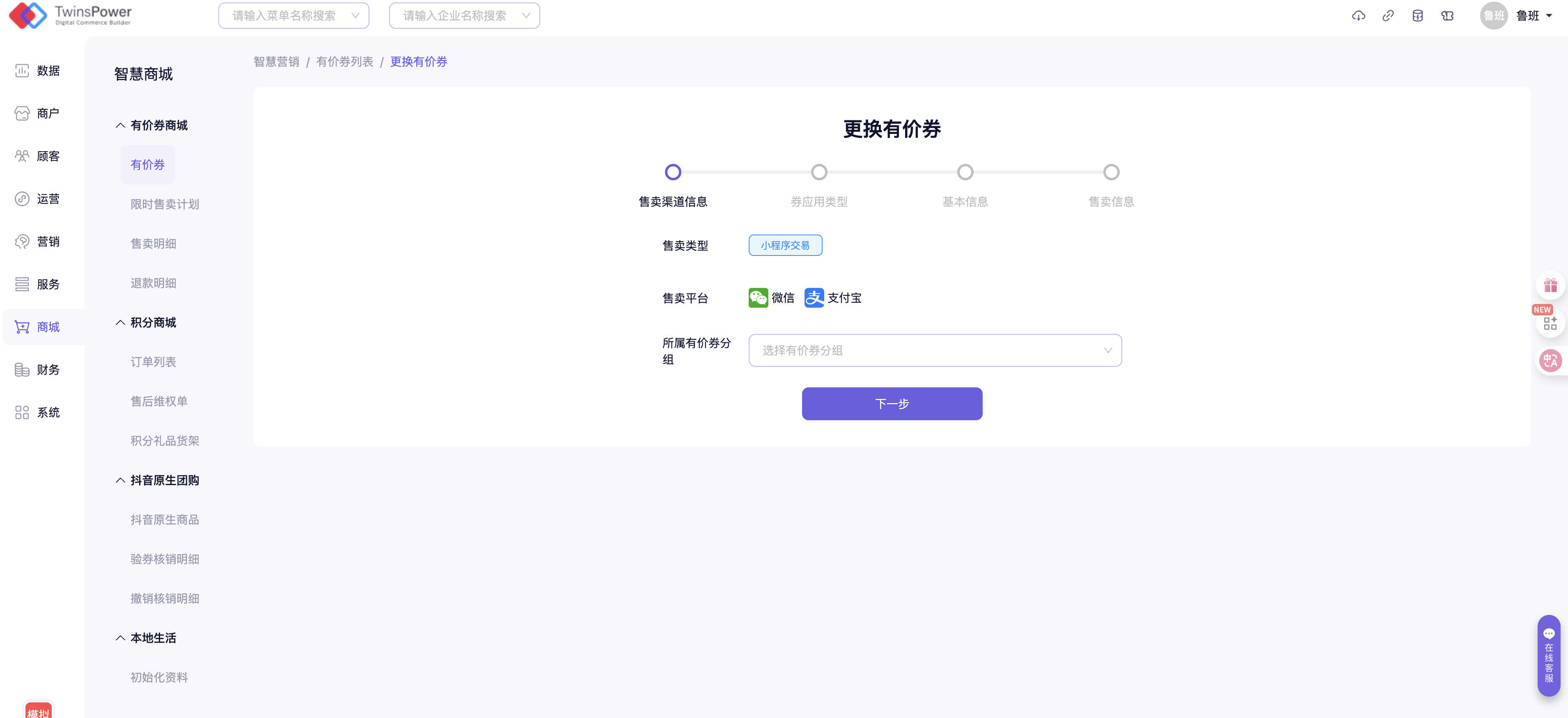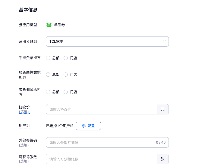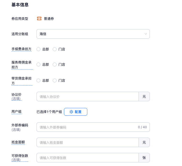 用户组:当前券母版仅限选中用户组可见可用,即可设置指定用户组成员对该券母版进行上架等操作