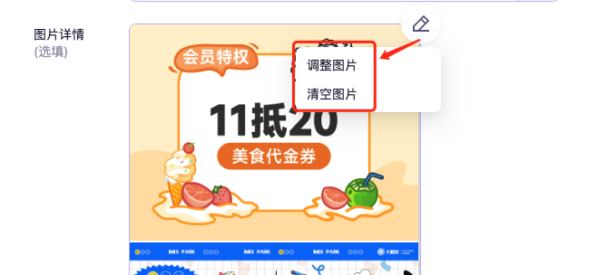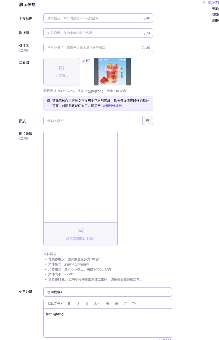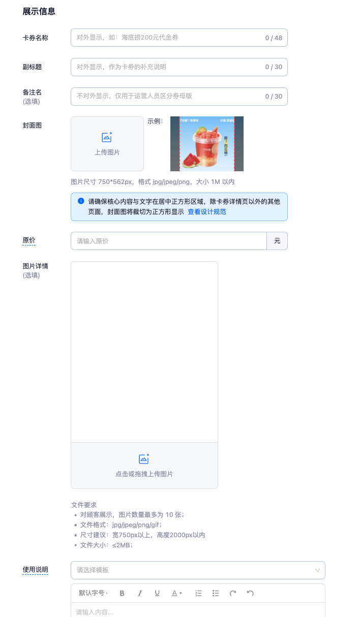 - 封面图:卡券对外展示图,图片尺寸 750*562px,格式 jpg/jpeg/png/gif,大小 1M 以内