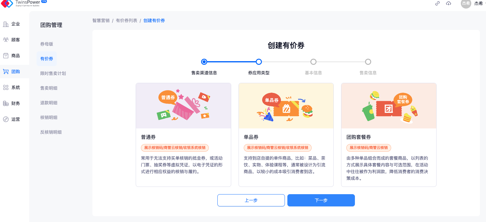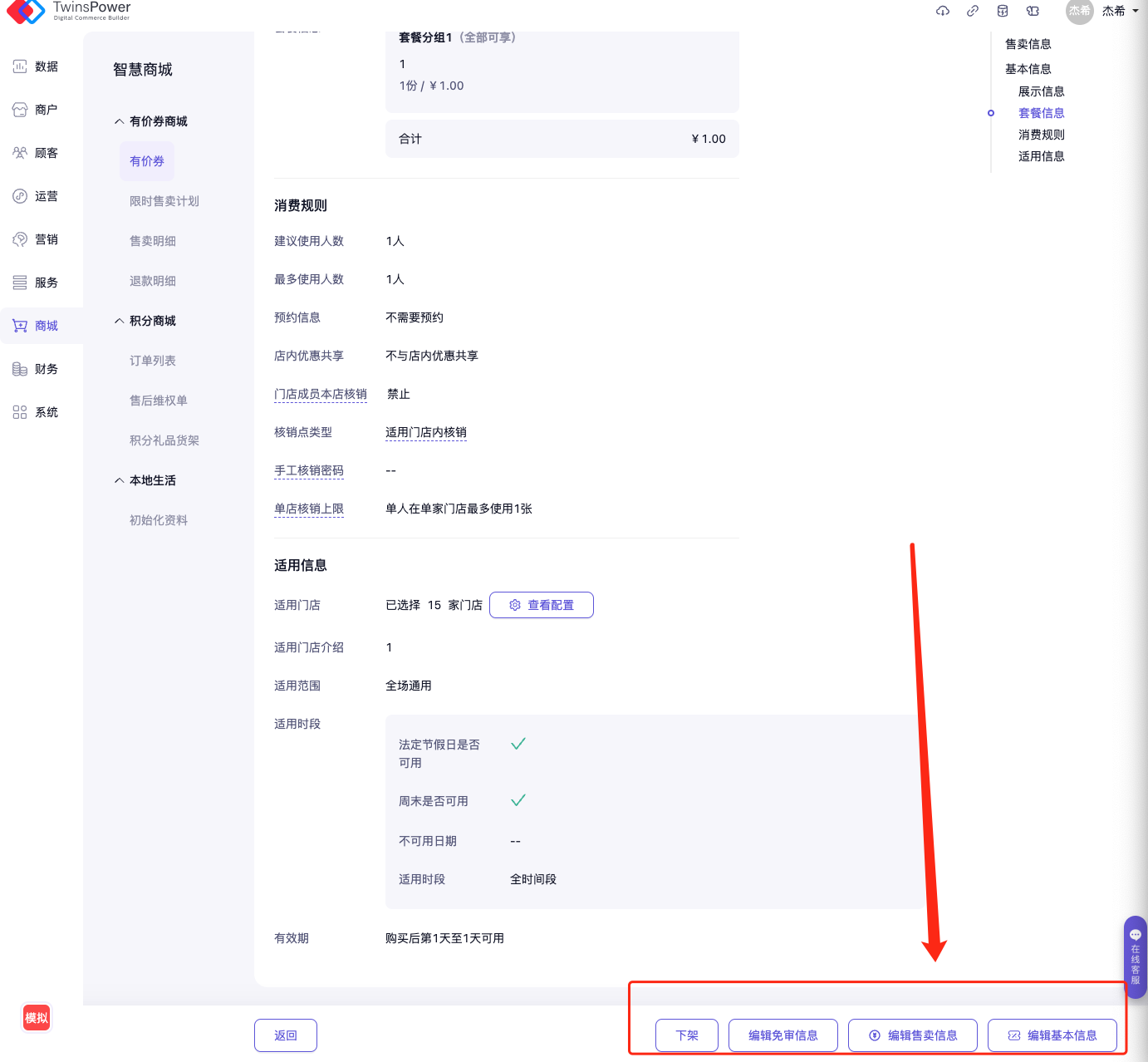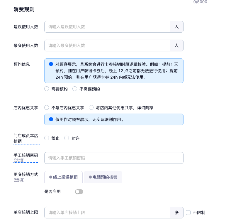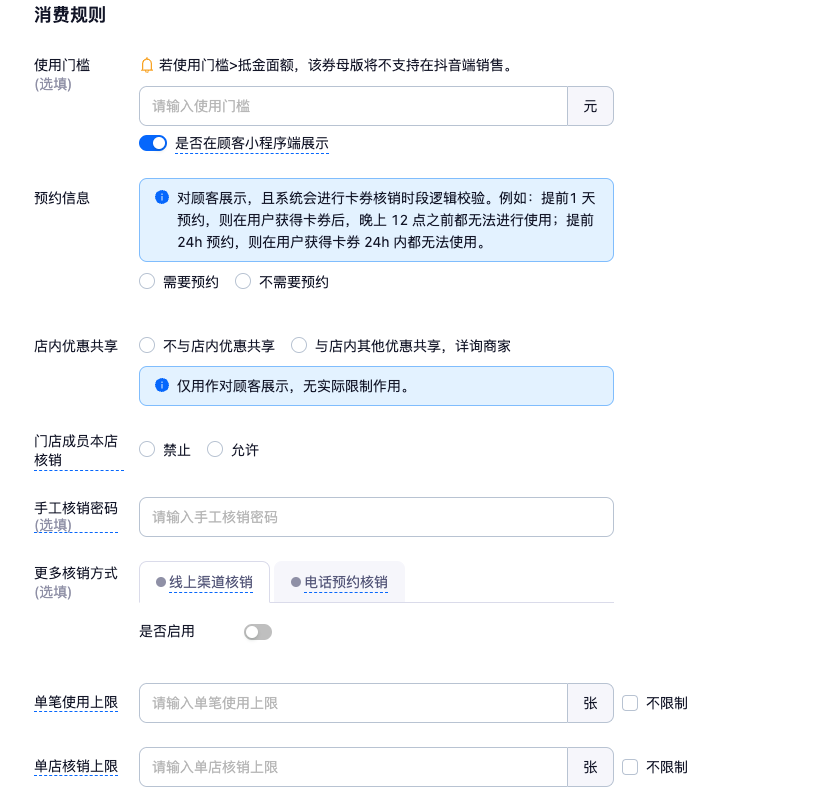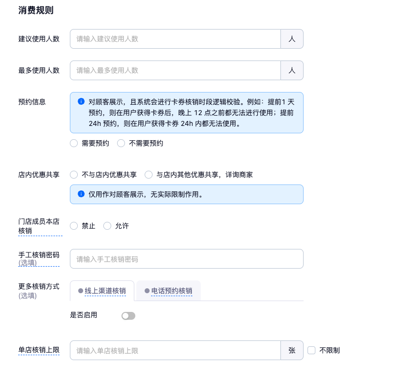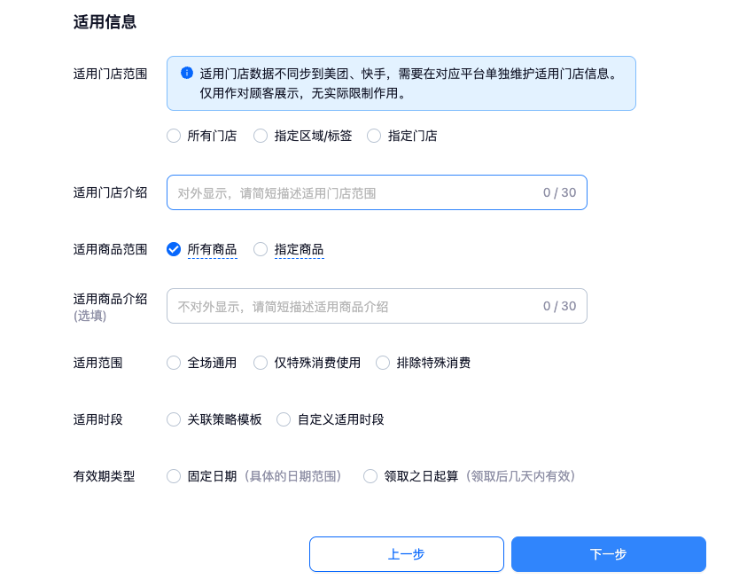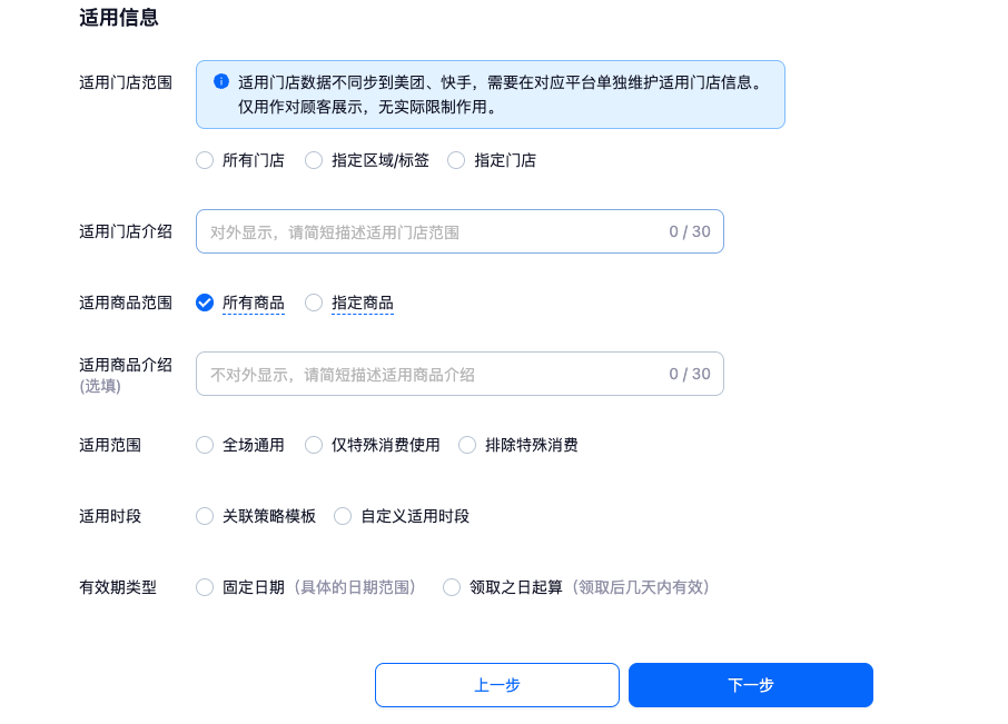 - 适用商品类型:"普通券","单品券","团购套餐券","权益包","闪电买单抵金券"