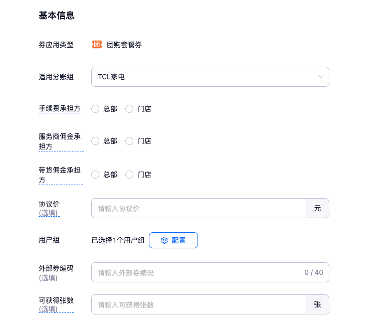 协议价(选填):与门店协商好的协议价,即为卡券核销后门店能拿到的钱。此处为针对该卡券中所有适用门店进行批量设置,如相同售价的卡券对不同门店涉及结算金额不同时,需要对其进行分开创建。