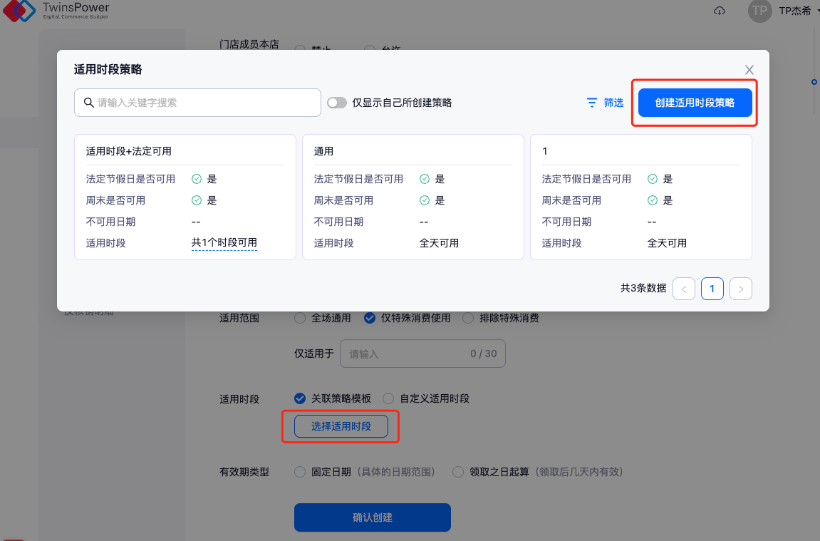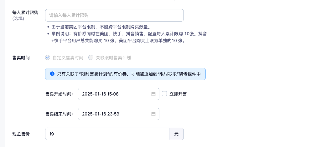 当我们需要在同一个时间段去售卖多个商品/卡券时,可先设置限时售卖计划,这样在创建有价券的售卖时间设置中,直接关联限时售卖计划即可实现同个时间售卖多张券。