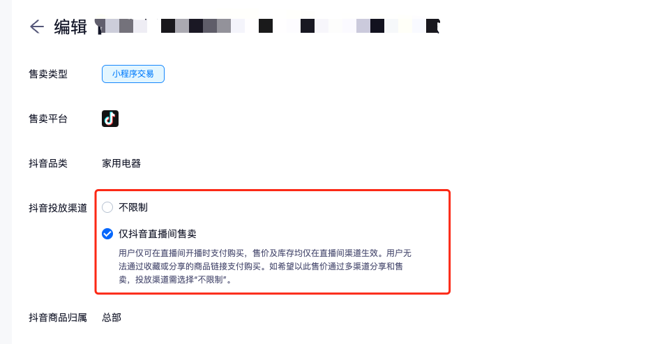 - 仅直播间:若选择仅抖音直播间售卖时,用户仅可在直播间开播时支付购买,售价及库存均仅在直播间渠道生效。用户无法通过收藏或分享的商品链接支付购买