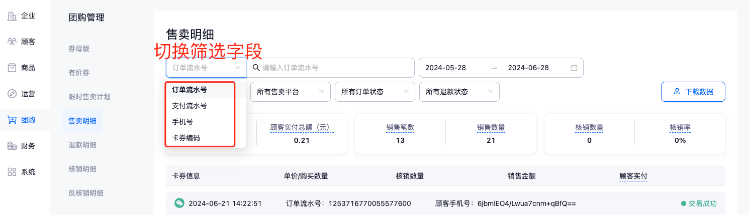 在【团购管理 → 售卖明细】中查看所有的有价券销售明细,可以通过对应的订单流水号/支付流水号/手机号/卡券编码来查找指定的售卖明细,也可以通过时间核销状态等其他条件进行筛选查看符合某种条件的销售明细。