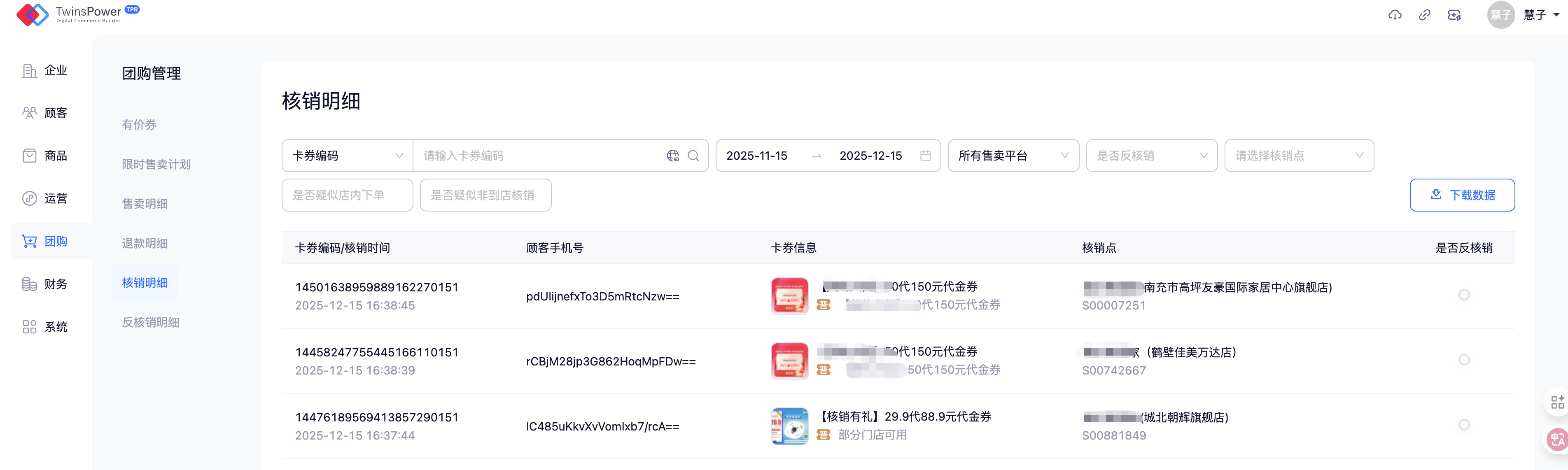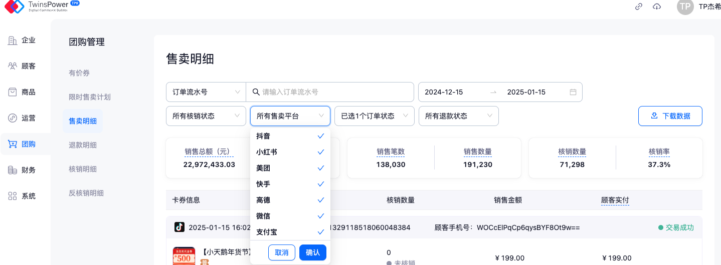 - 售卖明细中包含顾客下单时间、卡券编码、顾客实付、是否核销等信息