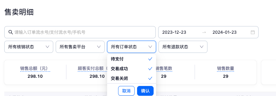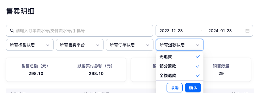 - 支持选择指定售卖平台,指定退款状态进行筛选查看