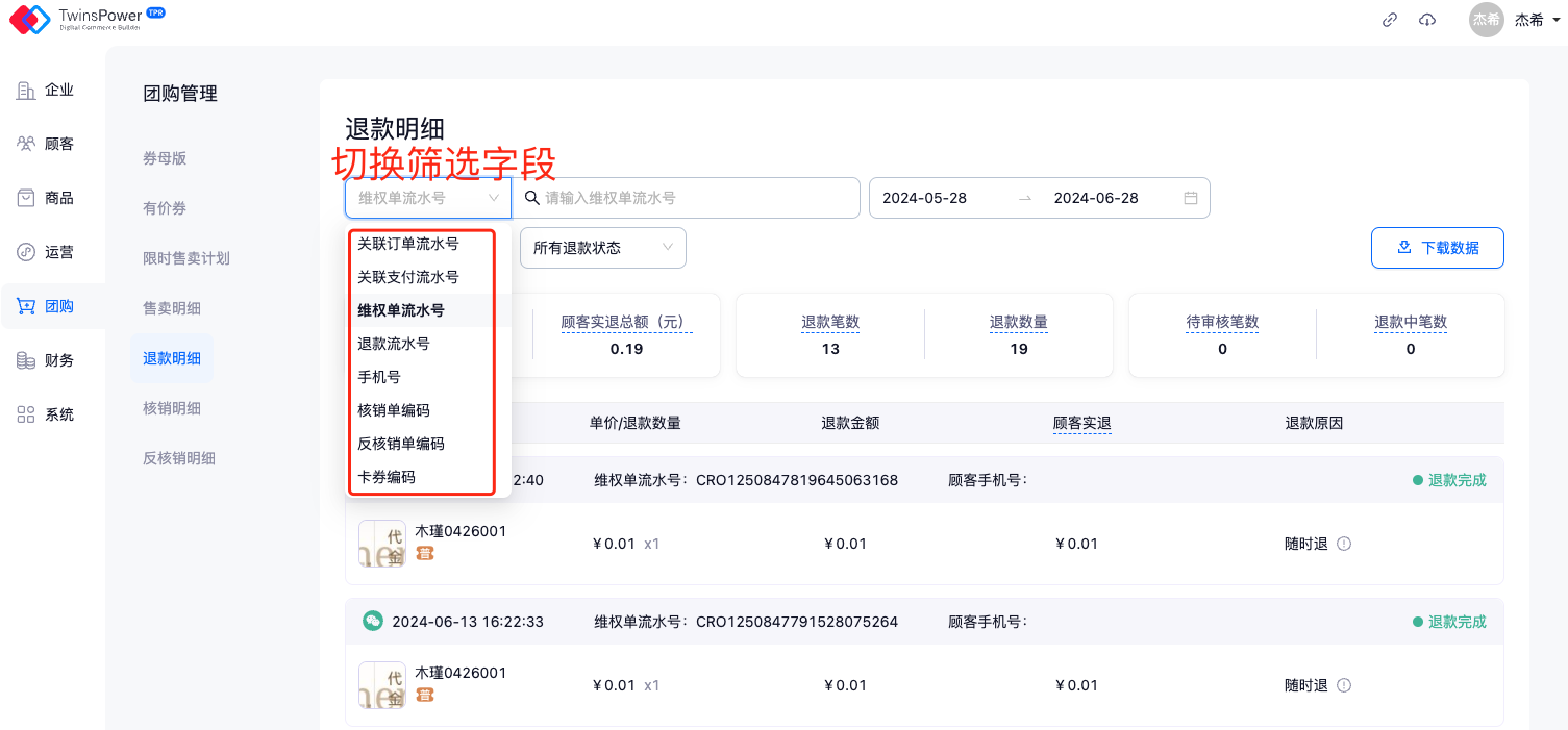 - 根据维权单流水号/关联订单流水号/关联支付流水号/退款流水号/手机号/核销单编码/反核销单编码/卡券编码进行指定退款订单搜索时,需要根据搜索的数据进行切换筛选字段