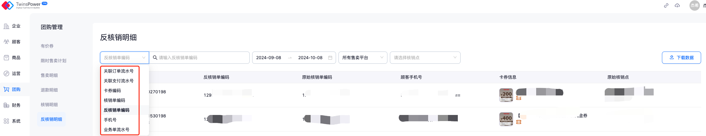 - 支持通过反核销单编码/卡券编码/手机号/关联订单流水号/关联支付流水号/业务单流水号进行指定的反核销数据的查询,需注意,用不同的数据进行搜索时需切换至对应的字段