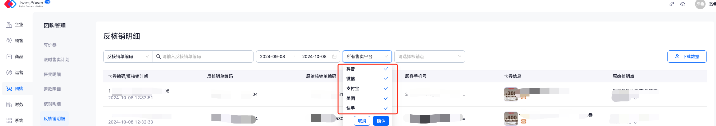 - 支持按照不同售卖平台进行反核销数据的查看