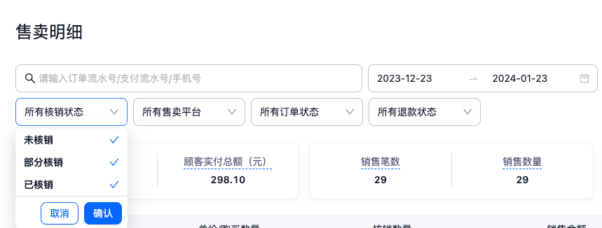 - 核销状态:支持同时勾选多个状态