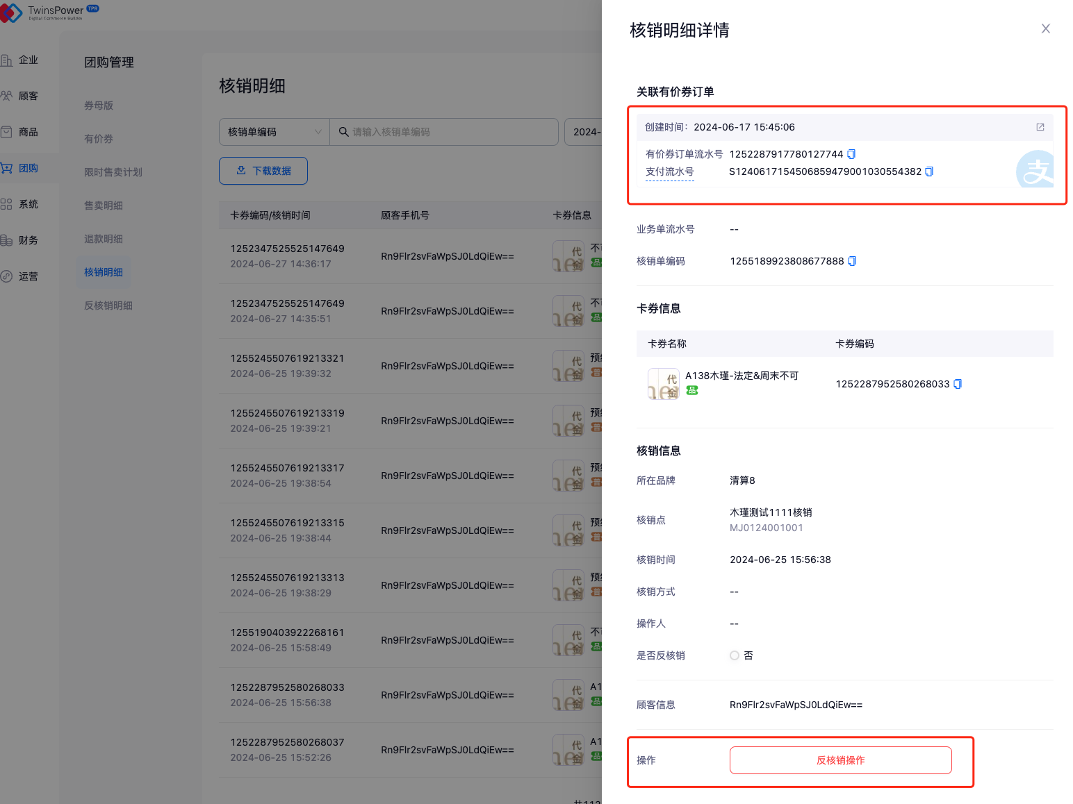 - 在反核销明细中可查看关联的有价券订单、反核销时间