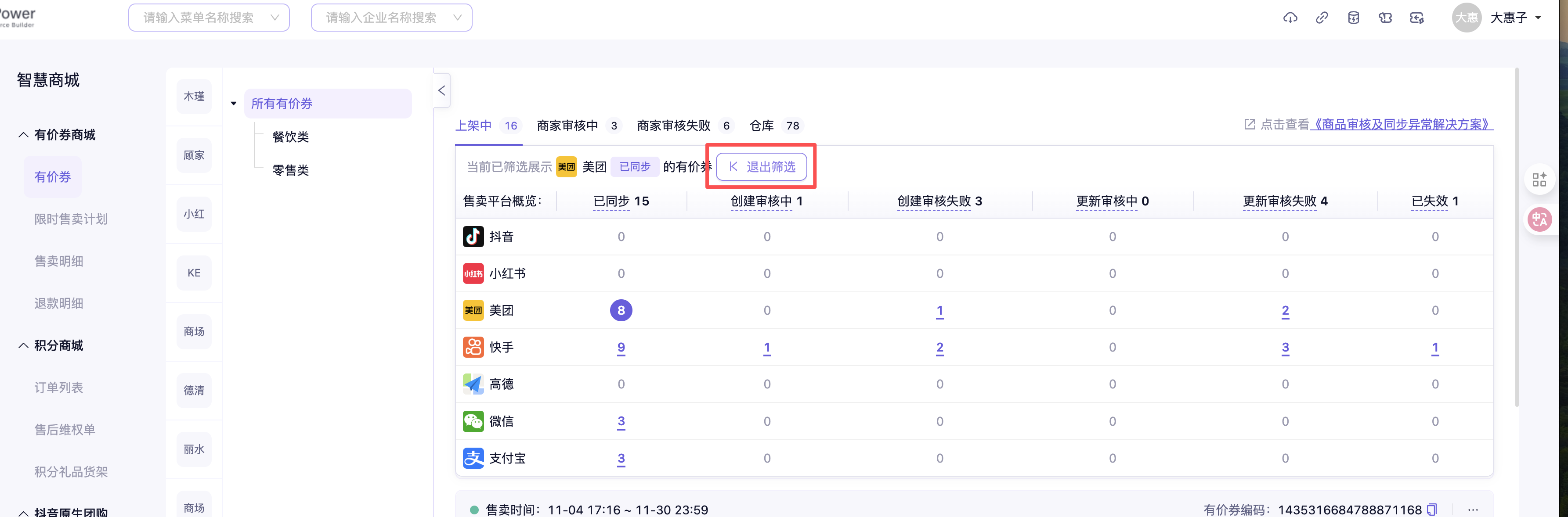 在售卖平台概览中点击查看不同状态的券数据后,需要点击「退出筛选」后,方可回到所有券列表中。若没有退出筛选,将会默认展示所筛选状态的卡券信息。