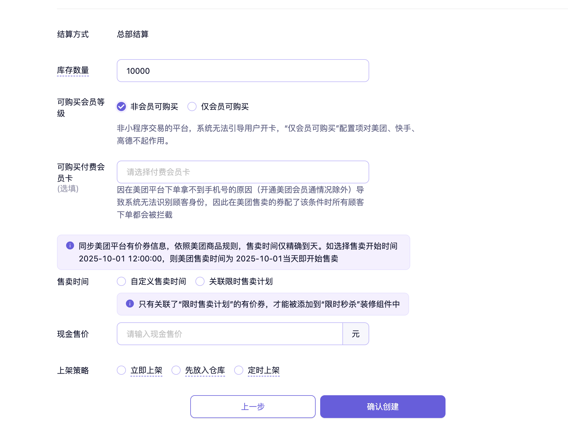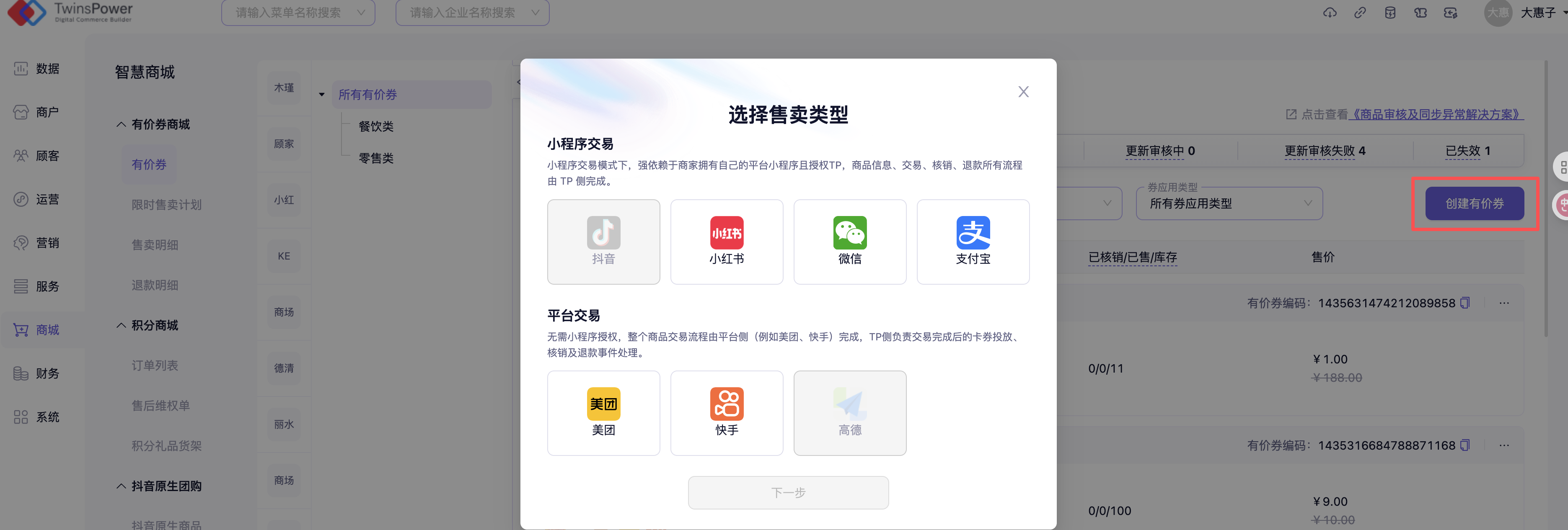 - 根据实际情况选择小程序交易和平台交易,例如需在抖音和美团售卖时,勾选抖音和美团即可。券创建成功后,售卖平台无法再次修改,如需修改,只能重新创建有价券。