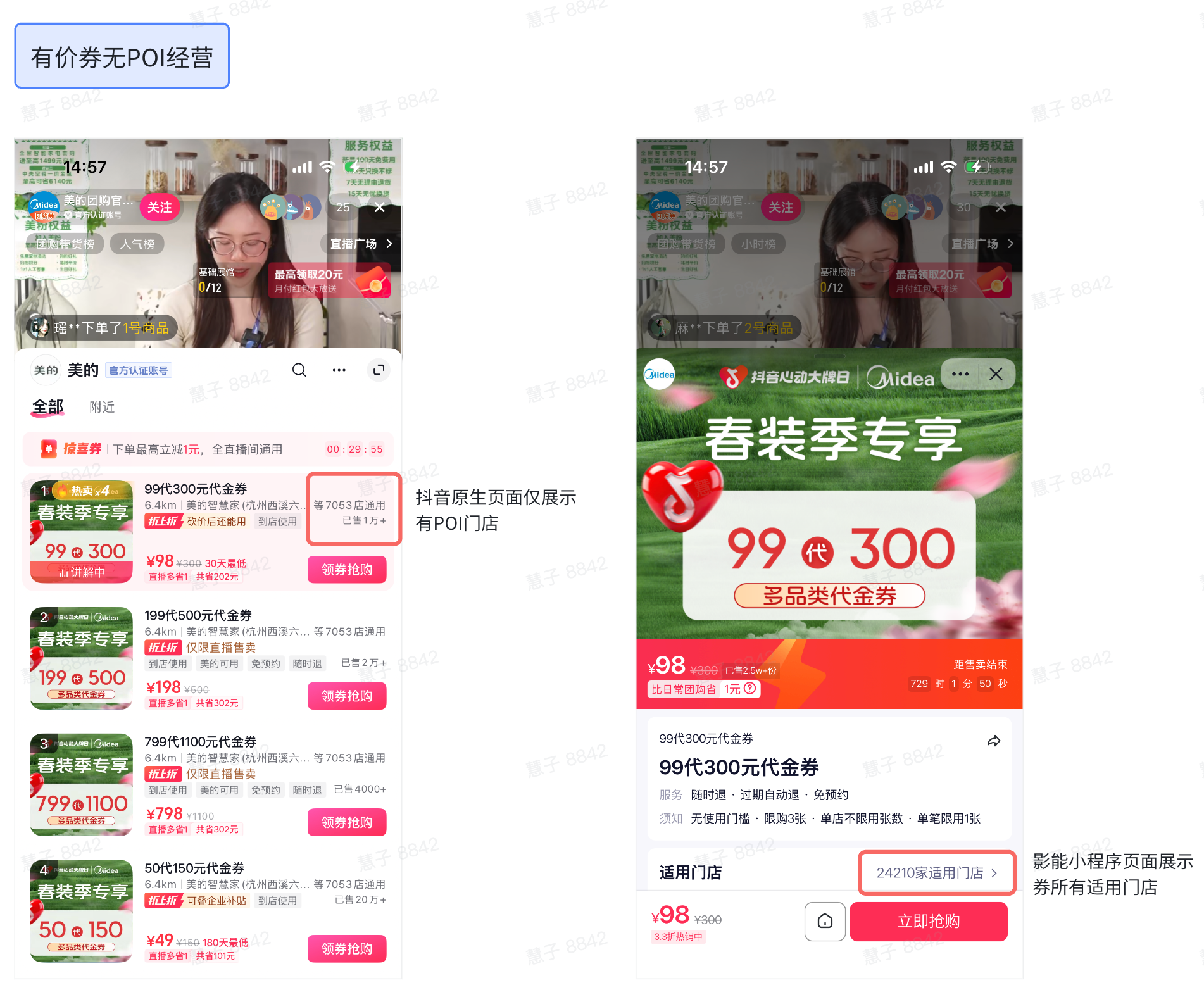 - 展示规则:无POI门店不在平台 POI 货架展示商品;有POI门店可在POI页面上正常展示并售卖卡券
