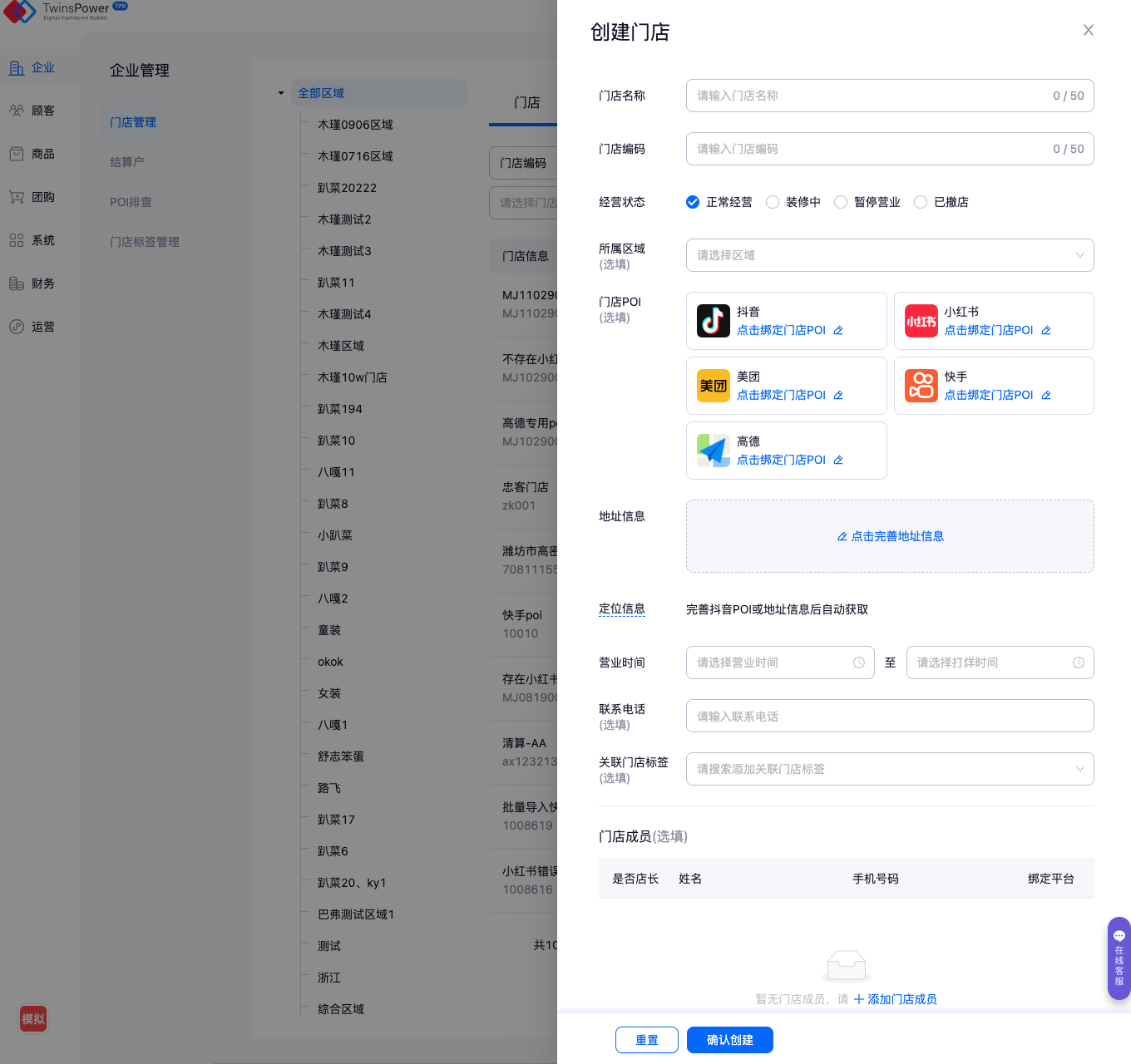 - 经营状态:正常经营、装修中、暂停营业、已撤店(不会再出现在选择列表中)
