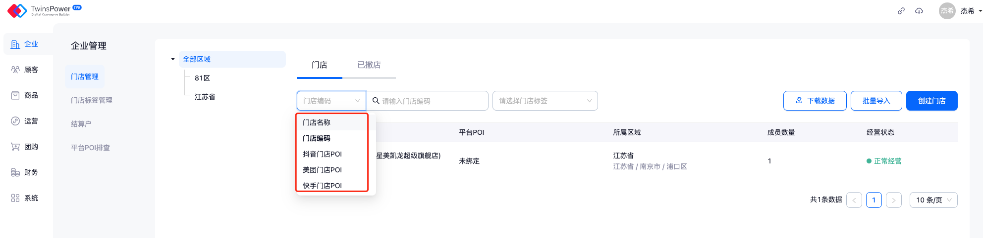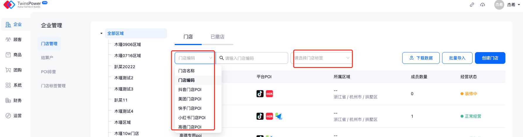 - 支持按照门店编码、门店名称、抖音门店POI、美团门店POI、快手门店POI、小红书门店POI、高德门店POI的维度进行指定门店的搜索。