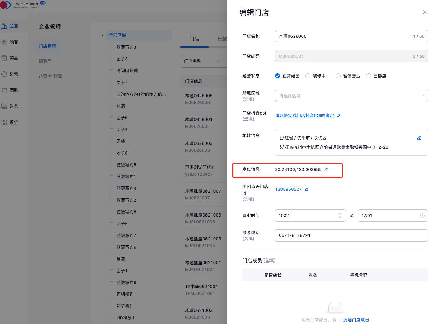 - 门店编码:作为门店的唯一编码,创建后不可修改