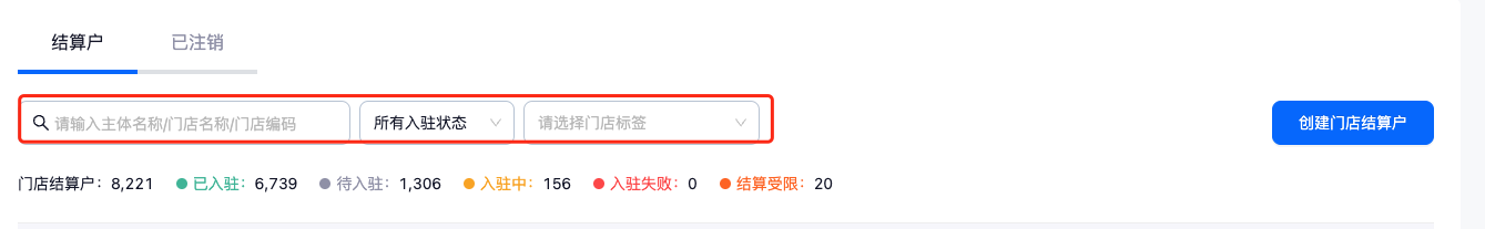 - 支持按照结算户入驻主体/门店名称/门店编码/外部结算户编码搜索查看指定结算户