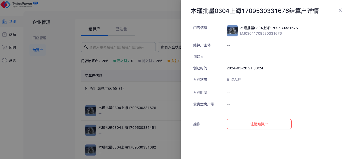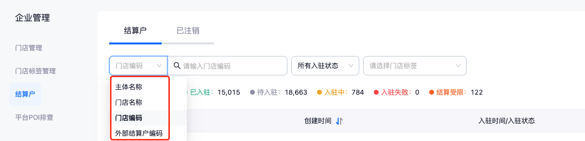 - 支持按照结算户入驻状态筛选指定状态下的结算户数据
