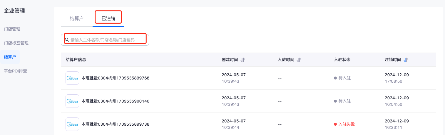 对于已注销的结算户,我们可以在此处查看记录,包括注销时间,注销的结算户名称等。支持按照主体名称、门店名称、门店编码查看注销结算户信息。